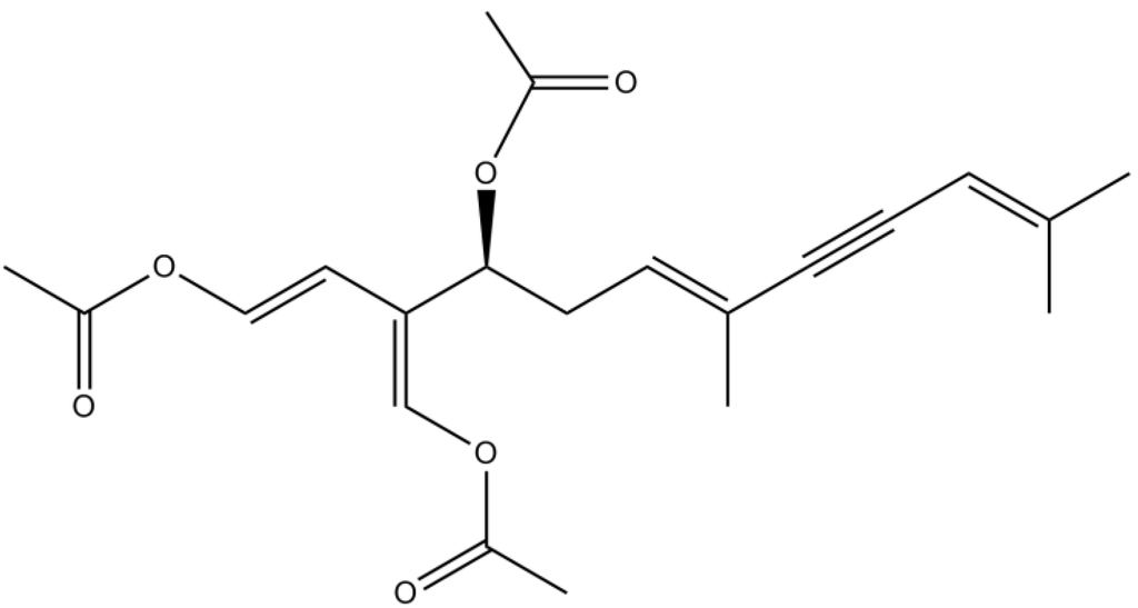 Chemical structure of (5E,10Z)-6,10,14-trimethylpentadeca-5,10-dien-2,12-dione (a) and (5E,9E,13E)-6,10,14-trimethylpentadeca-5,9,13-trien-2,12-dione (b).