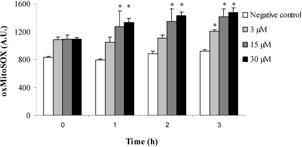 Based on our previous results obtained with trypomastigotes treated with (−)-elatol [11], we evaluated the production of superoxide anions (O2•−), a reactive species of oxygen (ROS). The production of this radical was measured using a highly sensitive fluorimetric assay in mitochondria of the amastigote forms of T. cruzi treated with (−)-elatol. As shown in Figure 2, (−)-elatol significantly increased O2•− production at all concentrations of (−)-elatol tested over 3 h compared with untreated cells. A 60% increase was observed in higher concentration compared with the negative control. The positive control with antimicyn A also increased mitochondrial O2•− production (data not shown).