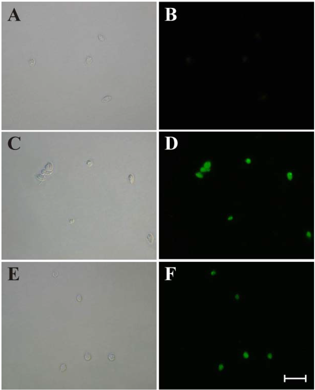 DNA fragmentation in amastigote forms of Trypanosoma cruzi treated with (−)-elatol for 24 h using TUNEL assay. The gray column is differential interference contrast (DIC), and the black column is fluorescence. Untreated amastigote forms (A and B). Amastigote forms treated with 1.5 μM (−)-elatol (C and D). Amastigote forms treated with 3 μM (−)-elatol (E and F). Scale bar = 10 μM.