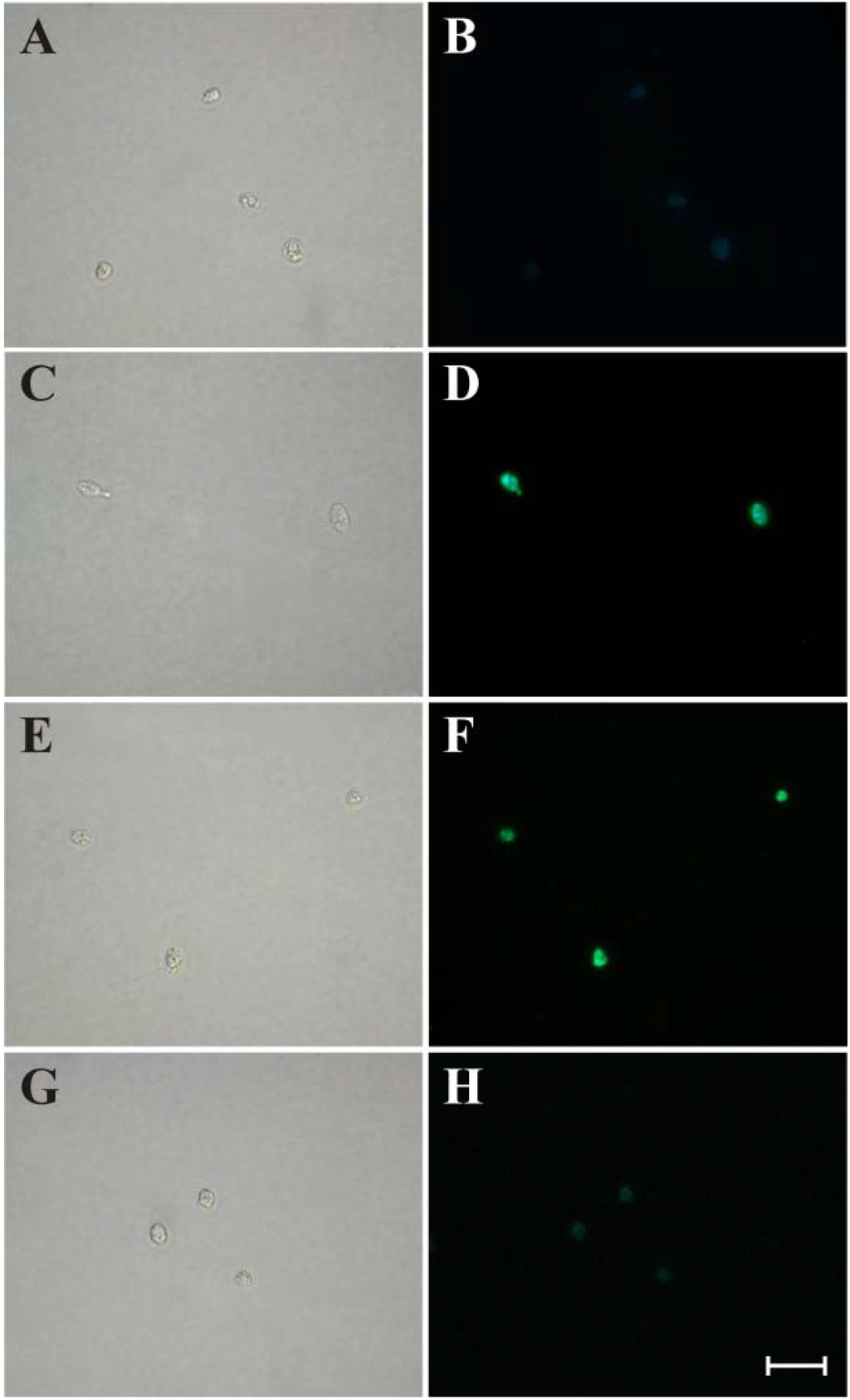 Autophagic compartments in amastigote forms of Trypanosoma cruzi treated with (−)-elatol for 24 h and stained with monodansylcadaverine. The gray column is differential interference contrast (DIC), and the black column is fluorescence. Untreated amastigote forms (A and B). Amastigote forms treated with 1.5 μM (−)-elatol (C and D). Amastigote forms treated with 3 μM (−)-elatol (E and F). Amastigote forms treated with 3 μM (−)-elatol + 500 nM wortmannin (G and H). Scale bar = 10 μM.