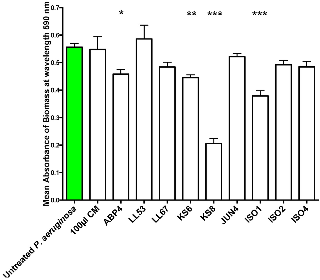 Biofilm prevention assay. 24 h biofilm biomass (mean absorbance of biomass at 590 nm) of P. aeruginosa PAO1 (green) following 24 h exposure to 100 μL of sterile 3-day supernatants of marine isolates ABP4, LL53, LL67, KS6, KS8, JUN4, ISO1, ISO2, ISO4. CM = Conditioned media. Differences in mean absorbance were compared to the untreated control at each time-point and considered significant when p < 0.05 (* p < 0.05, ** p < 0.01, *** p < 0.001) according to the non-parametric Kruskal Wallis test with Dunn’s Multiple Comparison Test.