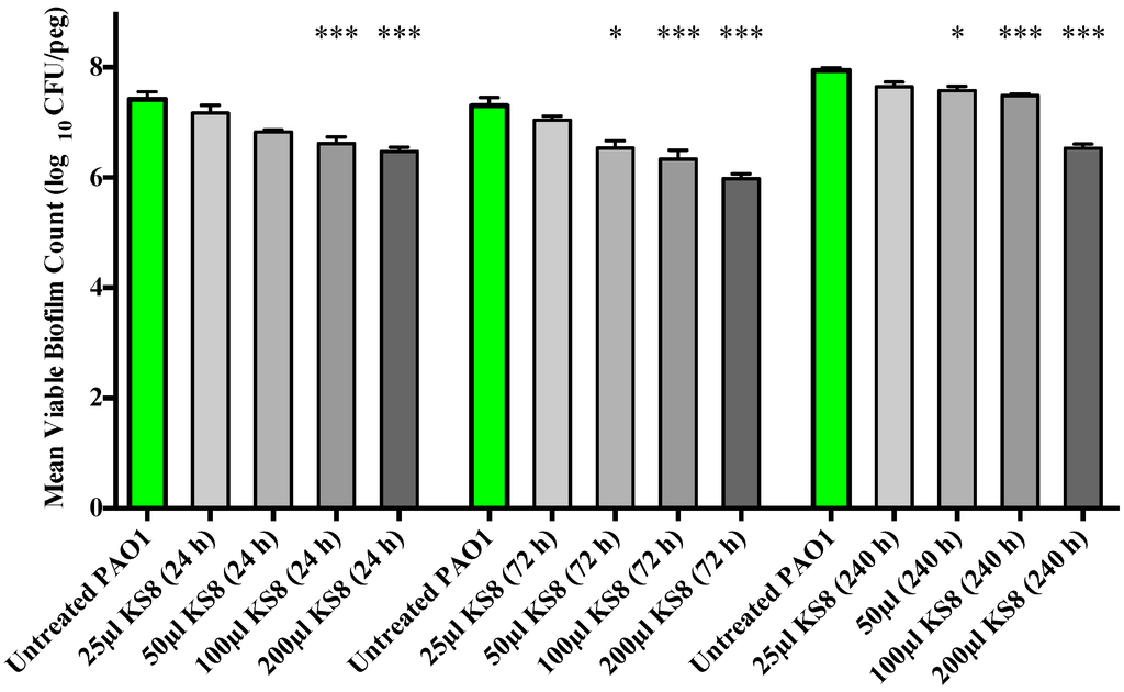 As the crystal violet microtitre plate assay measures biomass but fails to take into account cell viability, the study of the prevention of biofilm formation and biofilm eradication following exposure to the bioactives produced by isolate KS8 was conducted using the Calgary Biofilm Device (CBD, MBEC™ assay for Physiology & Genetics, Innovotech, Edmonton, Alberta, Canada). To determine an optimal incubation period for the production of bioactives, biofilm formation studies were conducted using 24, 72 and 240 h supernatants. Biofilm formation of P. aeruginosa PAO1 was significantly inhibited by the higher concentrations (100 and 200 μL) of all sterile KS8 supernatants (Figure 4) however the 72 h supernatant also caused a significant reduction when diluted in a 1:4 ratio (50 μL), and was thus chosen as the incubation time for the studies to follow. Although significant, the mechanism of such inhibition remains to be elucidated and it is unclear whether the reduction in biofilm formation by P. aeruginosa PAO1 is attributable to a reduced capacity to metabolize media, an increased rate of dispersal, a growth inhibitory effect or to a combination of effects. The sterile 3-day supernatant of isolate KS8 also displayed a significant antibiofilm activity (biofilm eradication) against mature P. aeruginosa PAO1, causing a 99% reduction in biofilm viable counts (Figure 5 and Table 2). The viable counts (log10 bfu/peg) of untreated 24 h PAO1 biofilms (7.264) did not vary significantly from the viable counts of untreated 48 h PAO1 biofilms (7.444) confirming the activities observed did not depend on the removal of biofilm or on the inhibition of growth during the test period (Supplementary Figure S2). Further work will be necessary to elucidate the mechanisms underlying the inhibition of biofilm formation and the biofilm eradication observed against this pathogen.