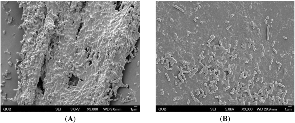 Scanning electron micrographs of (A) P. aeruginosa PAO1 biofilms grown on the CBD for 24 h at 37 °C; (B) PAO1 biofilms treated with KS8 8-day supernatant. Pictures were taken using using a field emission scanning electron microscope FE-SEM (JEOL JSM-6500F FE-SEM, JEOL Ltd., Tokyo, Japan).