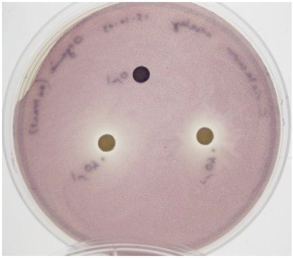 Solvent extraction was performed in an attempt to extract and concentrate the antibiofilm compounds produced by marine isolate KS8. Ethyl acetate extraction of supernatants is a standard technique routinely employed for the initial crude extraction of bioactives from microorganisms [70,71]. Growth curves of planktonic P. aeruginosa PAO1 treated with KS8 crude extract excluded growth inhibitory effects or antimicrobial effects at concentrations of the extract up to 1 mg/mL (Supplementary Figure S5). Moreover, screening of the organic crude extract of isolate KS8 against C. violaceum ATCC 12472 (Figure 7) and Serratia sp. ATCC 39006 using the disc diffusion assay confirmed the successful extraction of compounds with putative QSI activity. Heating the crude extract at 60 °C for 30 min did not affect the QSI activity displayed in the disc diffusion assay using C. violaceum ATCC 12472 (data not shown) suggesting the bioactive compound(s) involved are unlikely to be proteinaceous.