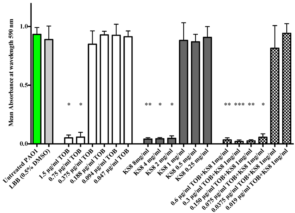 Enhanced antimicrobial activity of tobramycin when used in combination with KS8 organic extract against planktonic cultures of P. aeruginosa PAO1. The MIC value of tobramycin against PAO1 was determined to be 0.75 µg/mL. The MIC value of KS8 extract was determined to be 2.0 mg/mL. The MIC value of tobramycin used in combination with KS8 organic extract (1 mg/mL) was 0.075 µg/mL, a ten-fold decrease when compared to the MIC of tobramycin alone. DMSO in LB broth (0.5% w/v) was used as solvent control. Differences in mean absorbance were compared to the untreated control at each time-point and considered significant when p < 0.05 (* p < 0.05, ** p < 0.01, *** p < 0.001) according to the non-parametric Kruskal Wallis test with Dunn’s Multiple Comparison Test.
