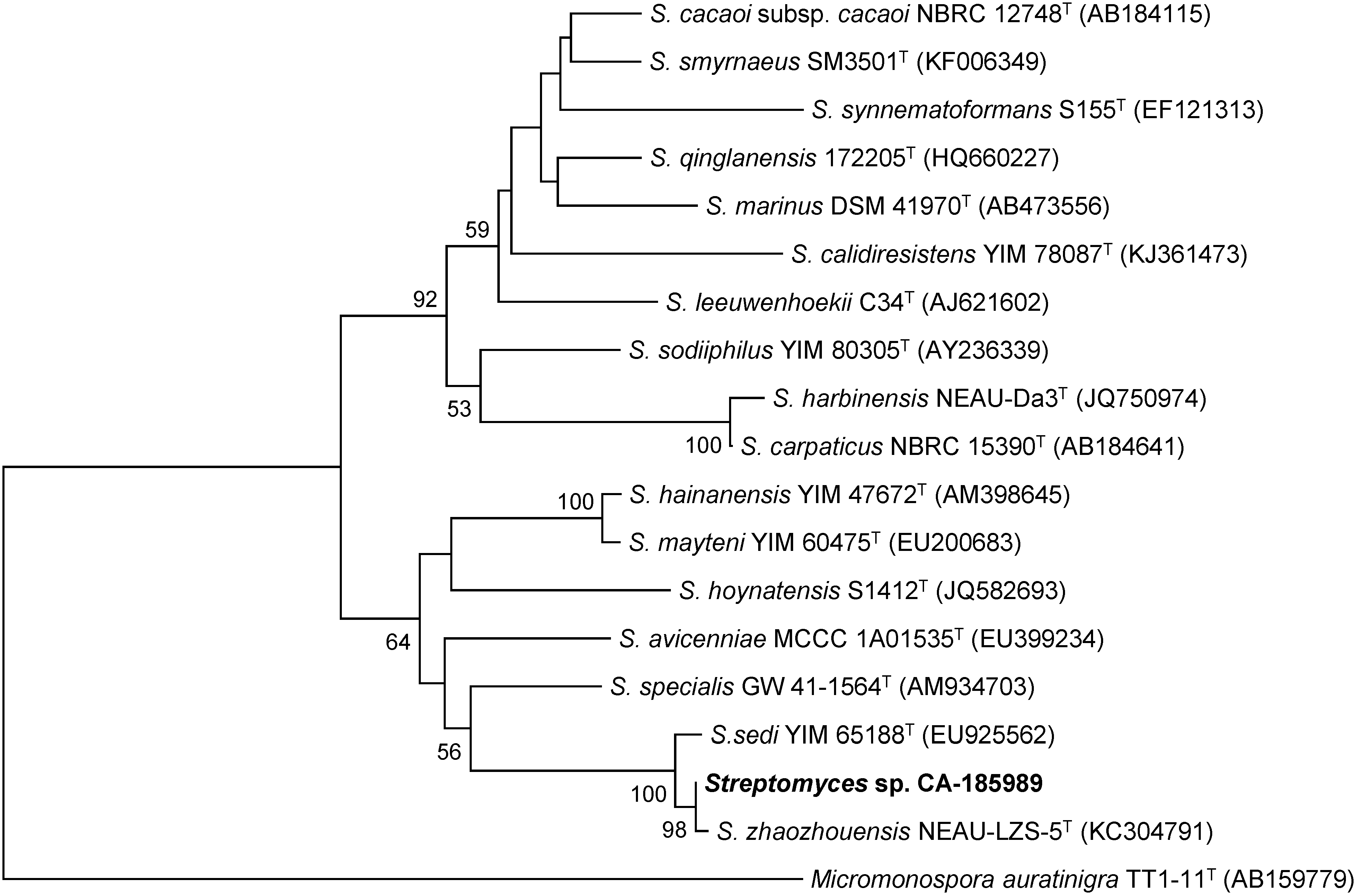 Neighbor-joining tree built with MEGA 6.06 based on nearly-complete 16S rRNA gene sequences of CA-185989 and the closest type strains of the genus Streptomyces. Micromonospora auratinigra TT1-11(T) was employed as an out-group. The numbers at the nodes indicate bootstrap support (%) based on NJ analysis of 1000 replicates; only values higher that 50% are shown. The scale bar indicates 0.01 substitutions per site.