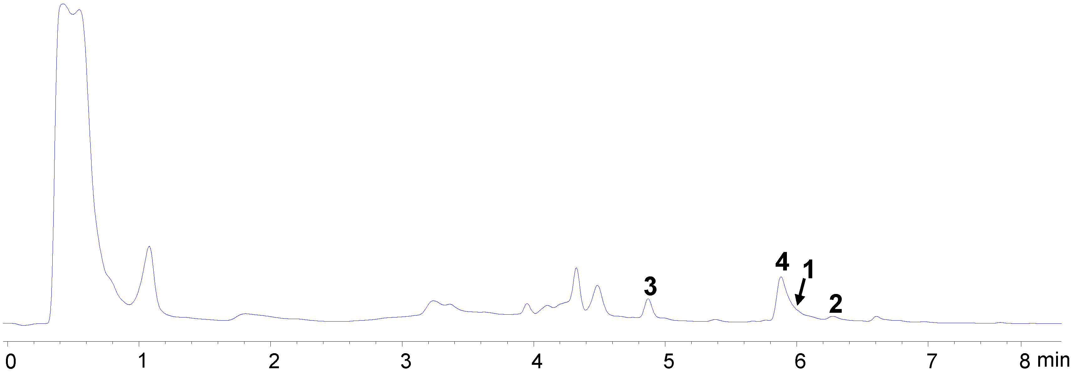 Chromatographic UV trace (210 nm) from the LC-UV-MS analysis of aqueous crude extract (ACE) where compounds 1–4 were detected.