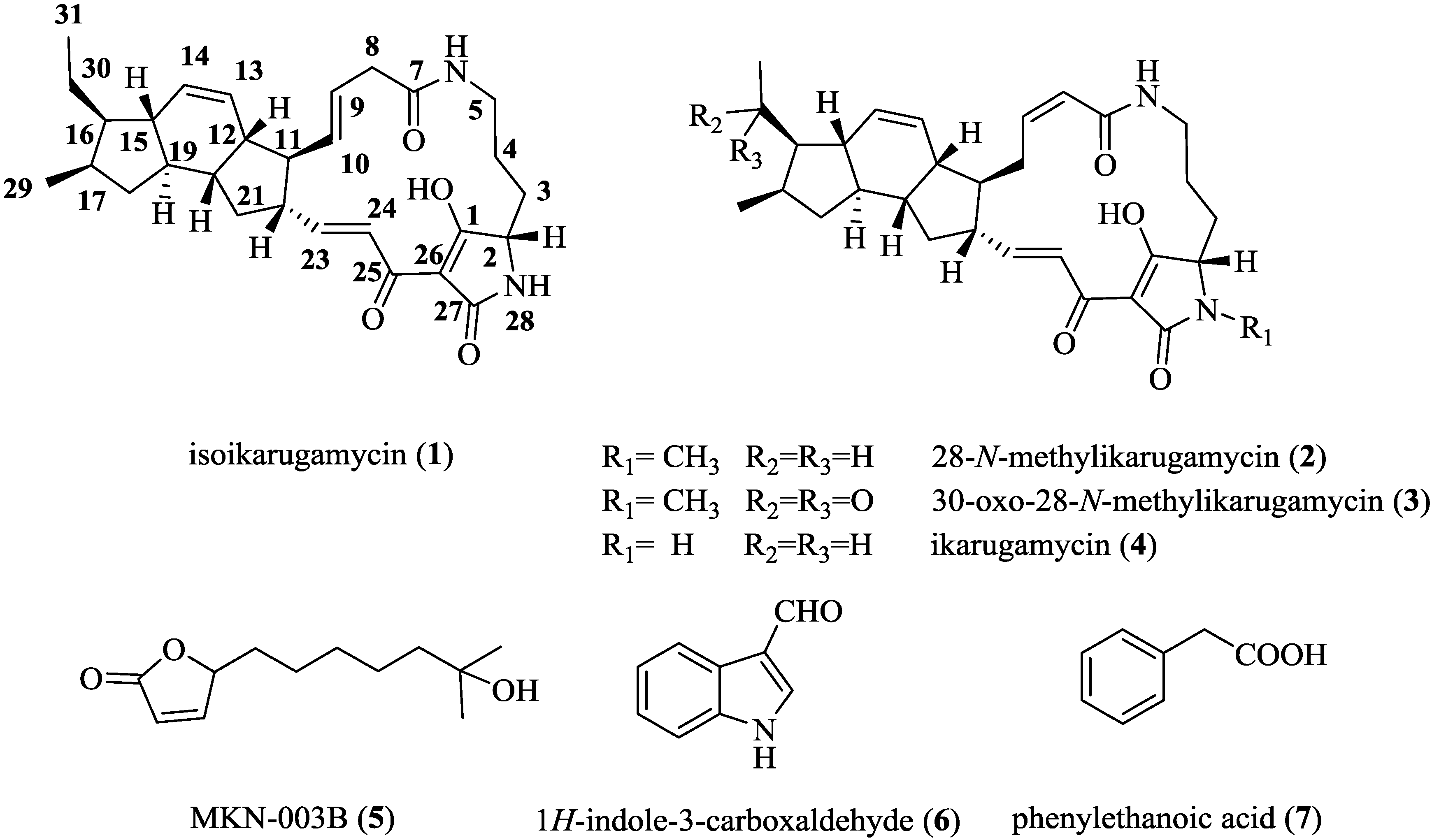 Further chromatographic separation of bioactive fractions from this chromatography on a reversed phase C8 column using a gradient CH3CN/H2O with 0.1% trifluoroacetic acid, allowed us to isolate seven compounds (1–7) (Figure 3). The spectroscopic data of 4–7 were identical to those previously reported for ikarugamycin (4) [5,6,18], MKN-003B (5) [19], 1H-indole-3-carboxaldehyde (6) [20] and phenylethanoic acid (7) [21]. All these compounds were isolated for the first time from the fermentation broths of S. zhaozhouensis. On the other hand, compounds 1–3 represent new natural products based on the structure of ikarugamycin (4).