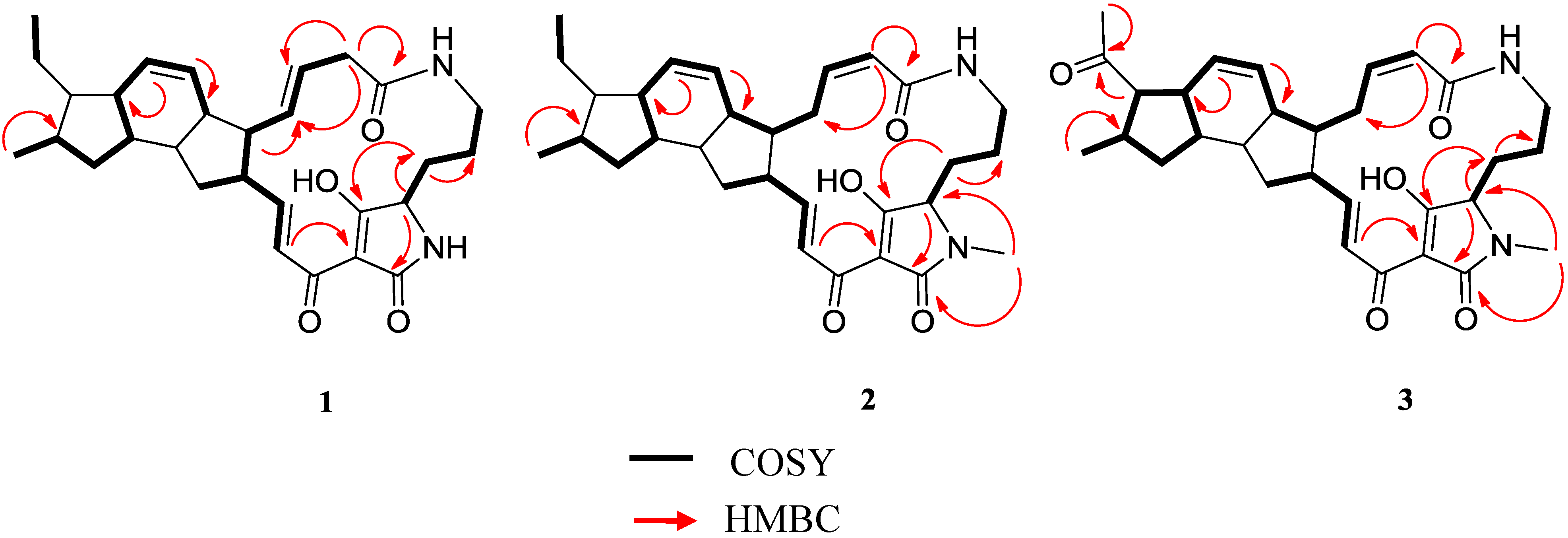 Key COSY and HMBC correlations observed in the spectra of compounds 1–3.