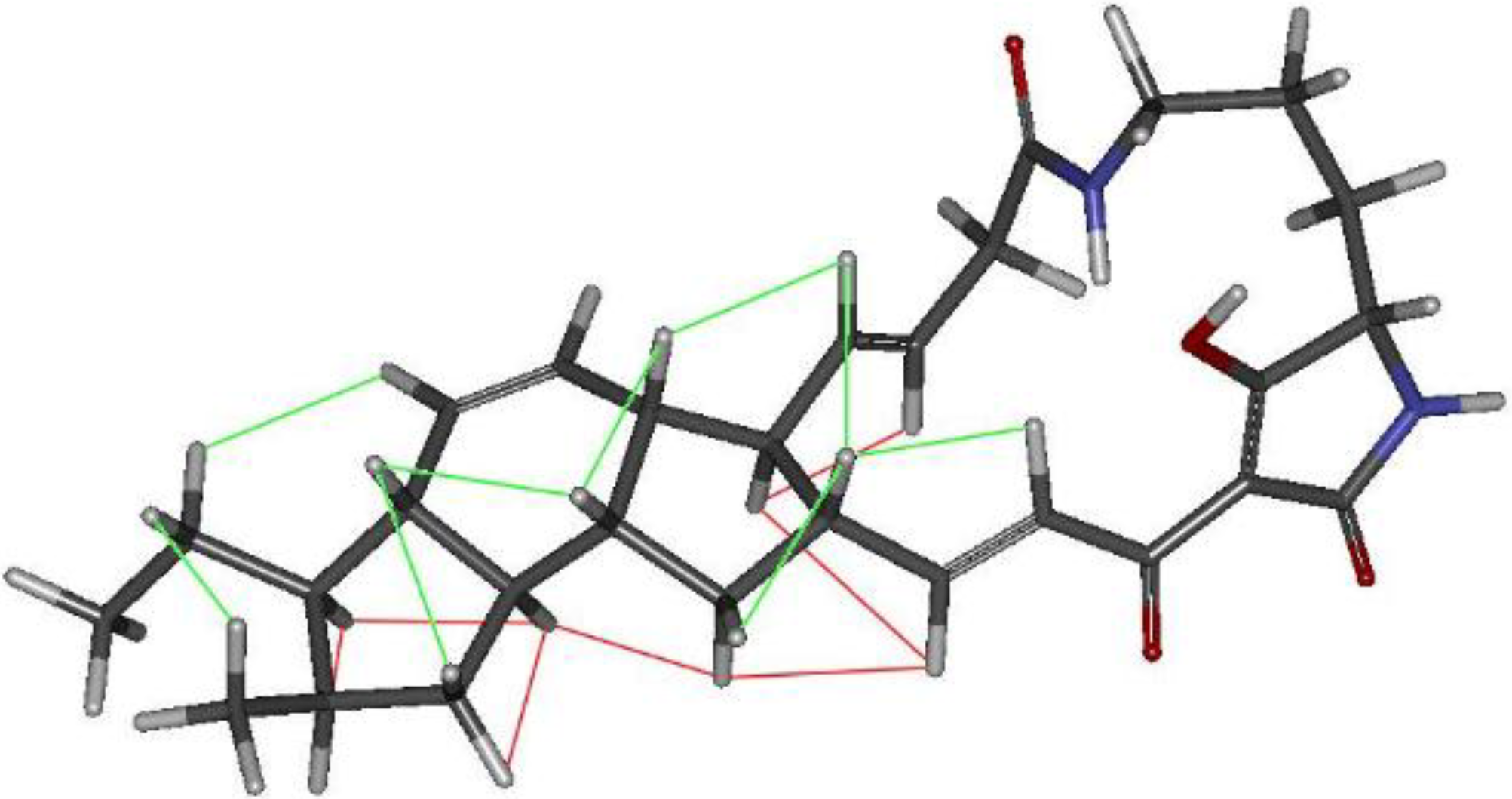 Molecular model of compound 1 showing the key observed NOESY correlations. The protons in β orientation (relative to the fused tricycle pseudoplane according to the 2D structure scketches) displaying mutual correlation are connected by green lines while red lines are employed for those in α orientation.