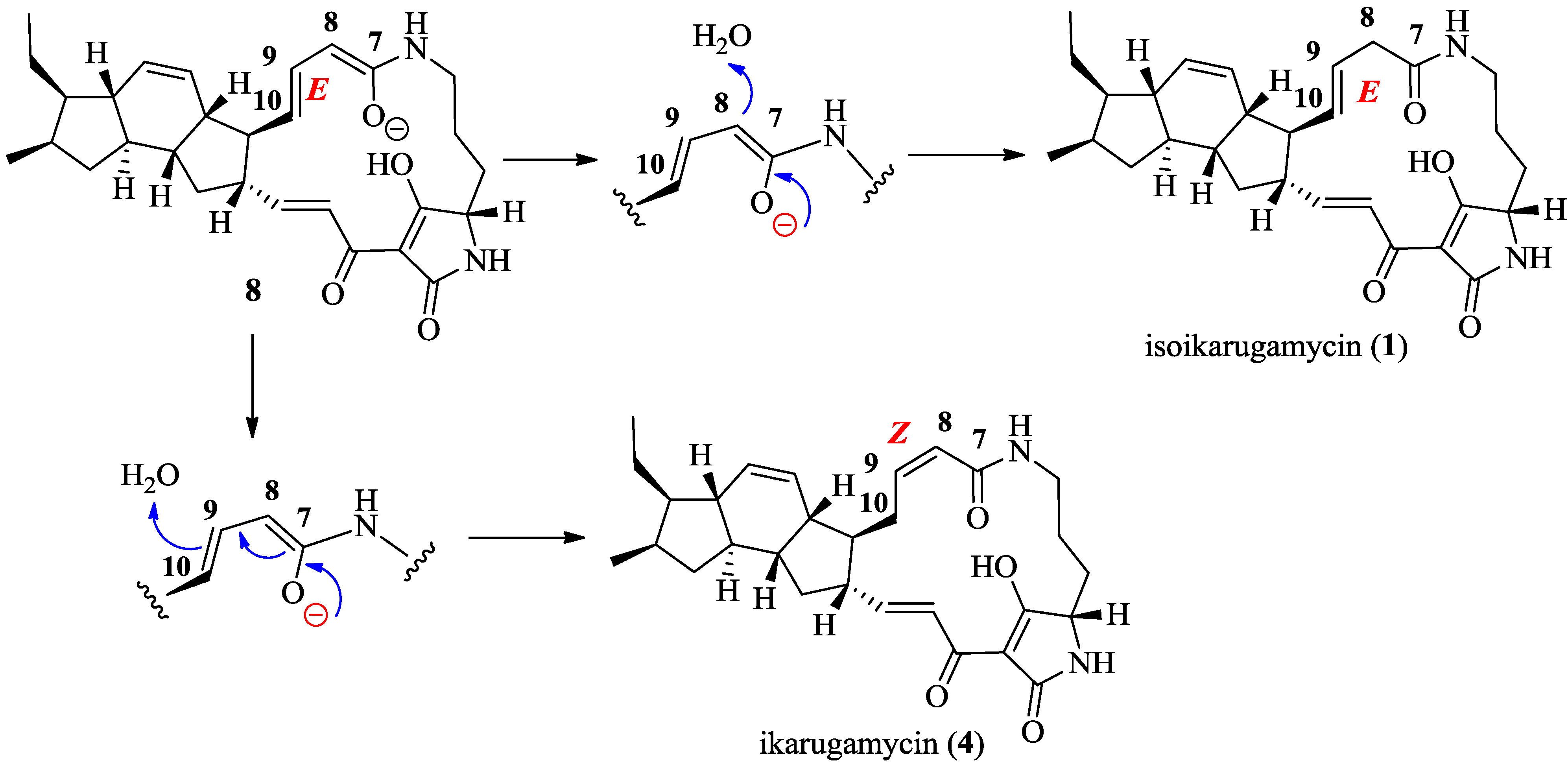 The relative configuration of 1 was deduced to be the same as that of ikarugamycin (4) on the basis of the key NOESY correlations observed for compound 1 (Figure 5, Figures S5 and S6) and the common biogenetic origin of both molecules. It has been recently proposed that PTMs share a common biosynthetic pathway [18,22]. A biosynthesis route through an electrophilic addition from the corresponding intermediate 8 was proposed for ikarugamycin (4) [18]. Similarly, the biosynthesis of compound 1 could be explained by the deprotonation of a water molecule by the C-7/C-8 enol transient intermediate, which also justifies the E the stereochemistry observed for the ∆9,10 double bond (Figure 6). The isolation of isoikarugamycin in the current work represents the first experimental evidence validating the proposed ikarugamycin biosynthetic pathway via intermediate 8. This is the first time that compound 1 has been isolated from a natural source and we have given it the trivial name isoikarugamycin.