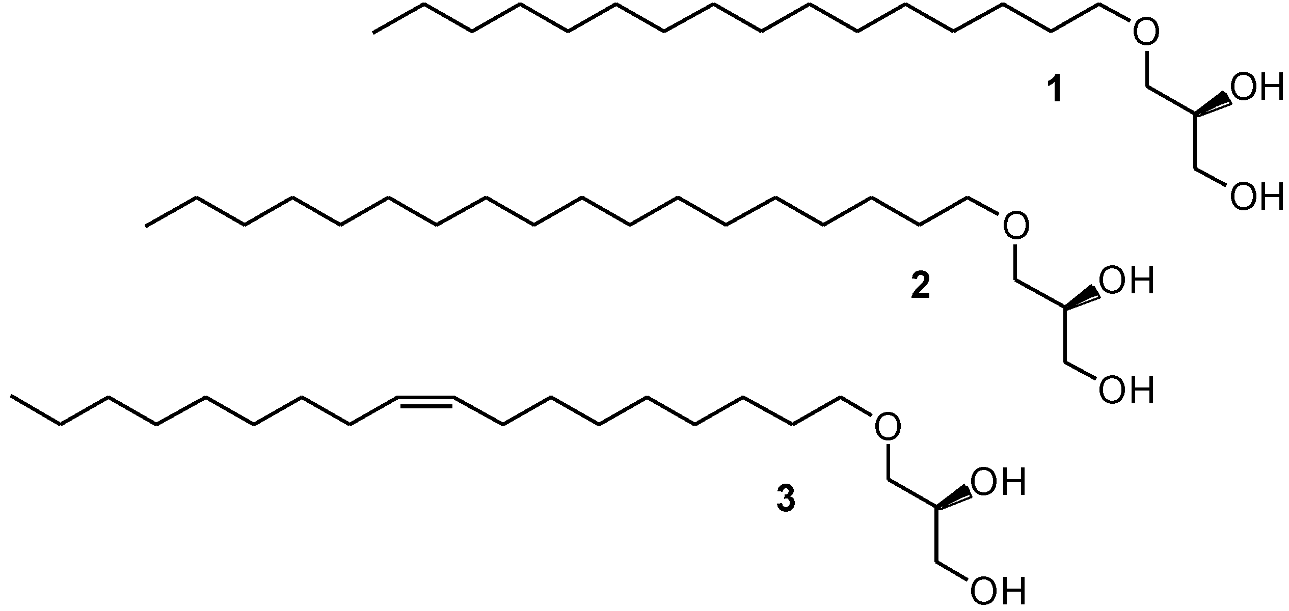 Chemical structures of chimyl (1), batyl (2) and selachyl (3) alcohols.