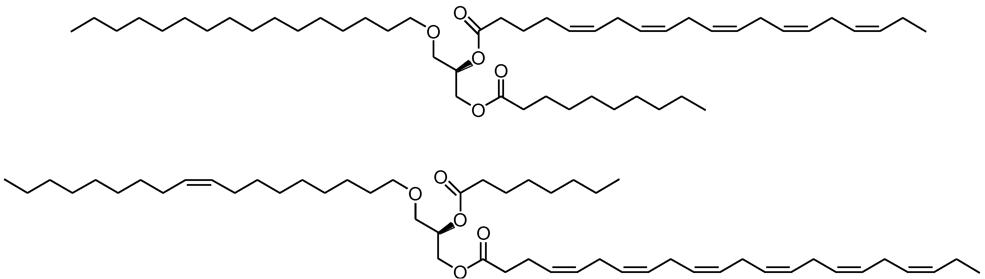 Chemical structures of a normal structured ALM (alkyl-long-medium) type DAGE (diacylglyceryl ethers) of chimyl alcohol possessing EPA at the sn-2 position and capric acid (C10:0) at the sn-3 position (top) and a reversed structured AML type DAGE of selachyl alcohol possessing DHA at the sn-3 position and caprylic acid (C8:0) at the sn-2 position (bottom).