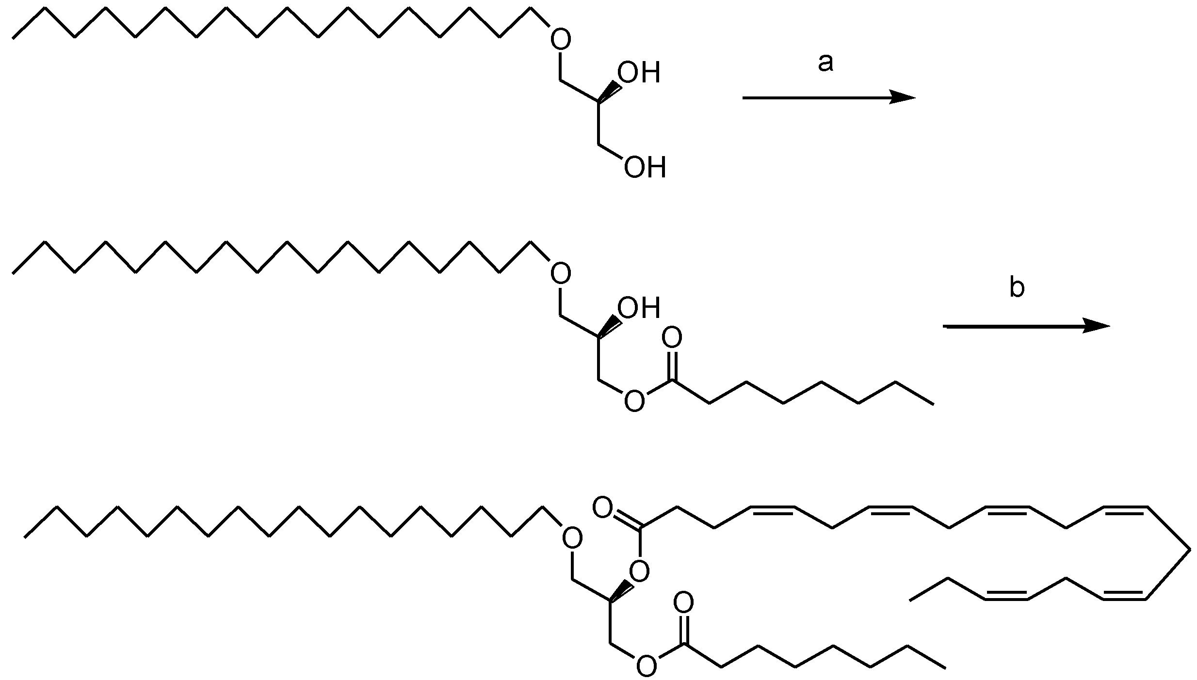 EPA and DHA were subsequently introduced to the remaining sn-2 position of the resulting 3-monoacylglyceryl ether (3-MAGE) intermediates by aid of 1-(3-dimethylaminopropyl)-3-ethylcarbo-diimide hydrochloride (EDAC) as a chemical coupling agent in presence of dimethylaminopyridine (DMAP) serving both as a base and catalyst in dichloromethane at r.t. All products and intermediates were obtained enantiopure in excellent yields of excellent chemical and regiopurity.