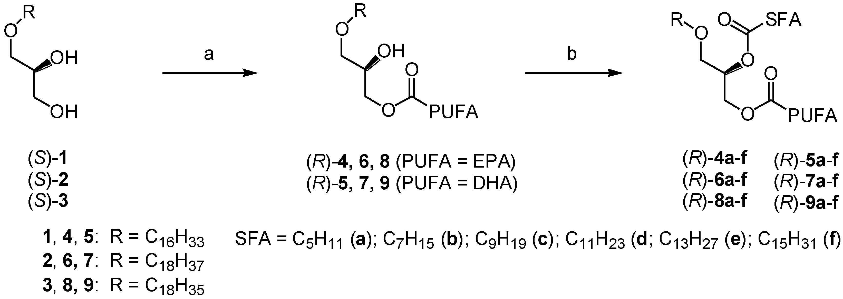 Reversed structured DAGE products constituting a pure saturated fatty acid (SFA) and EPA (4a–f) or DHA (5a–f) for the chimyl alcohol series obtained from the corresponding 3-MAGEs (R)-4 and (R)-5 (see the scheme in Figure 5), their yields and specific optical rotation.