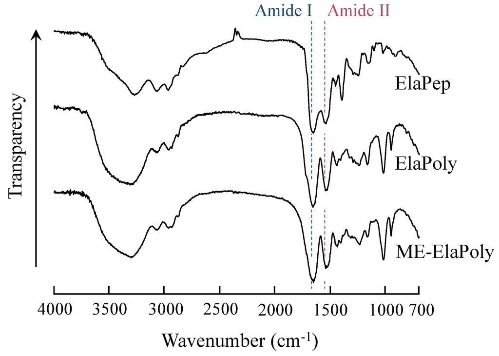FT-IR spectra of ElaPep, ElaPoly, and ME-ElaPoly.
