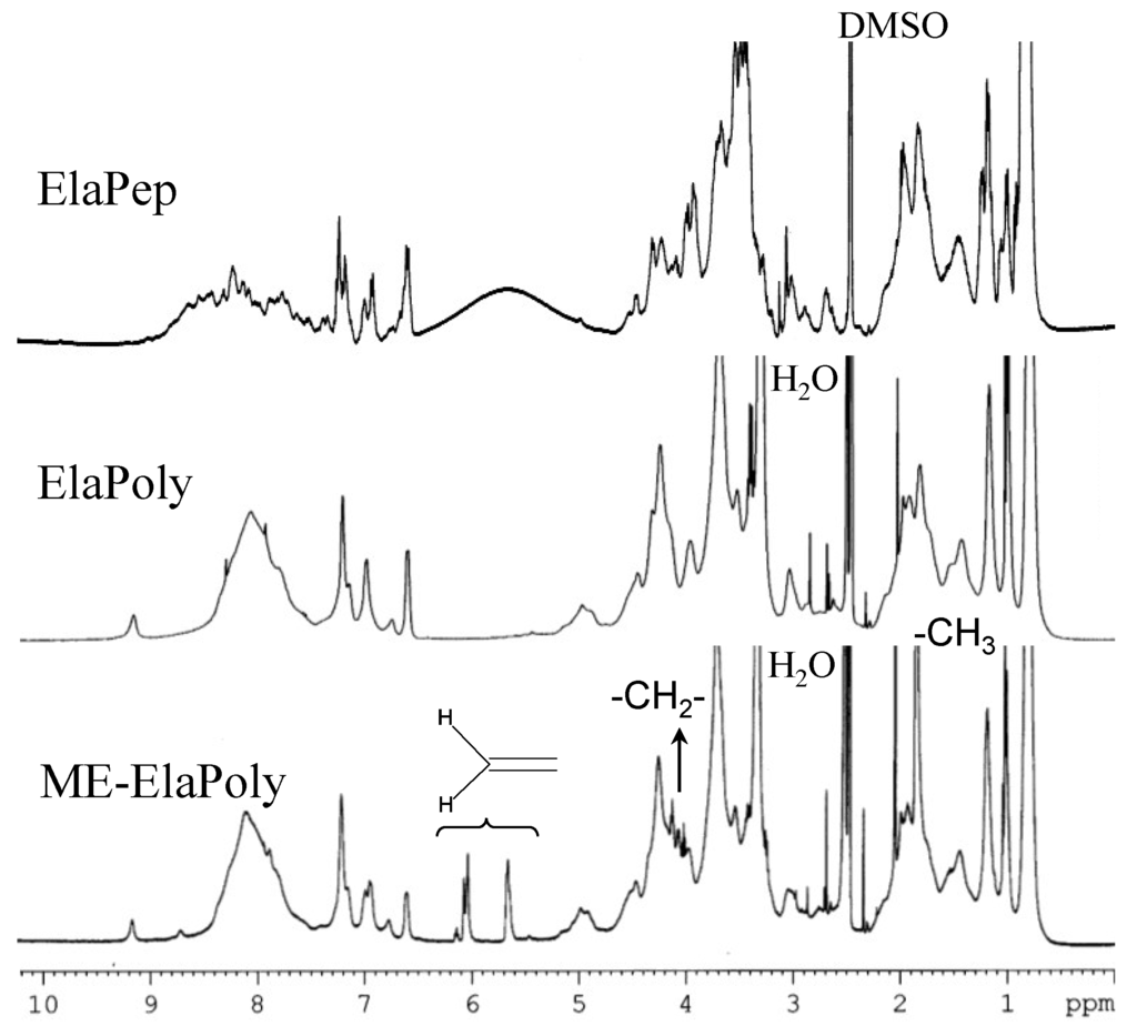 1H NMR spectra of ElaPep, ElaPoly, and ME-ElaPoly.