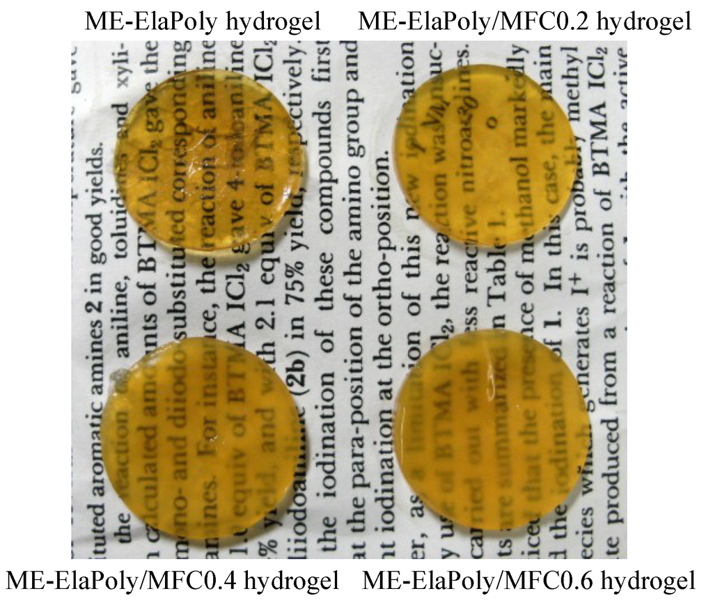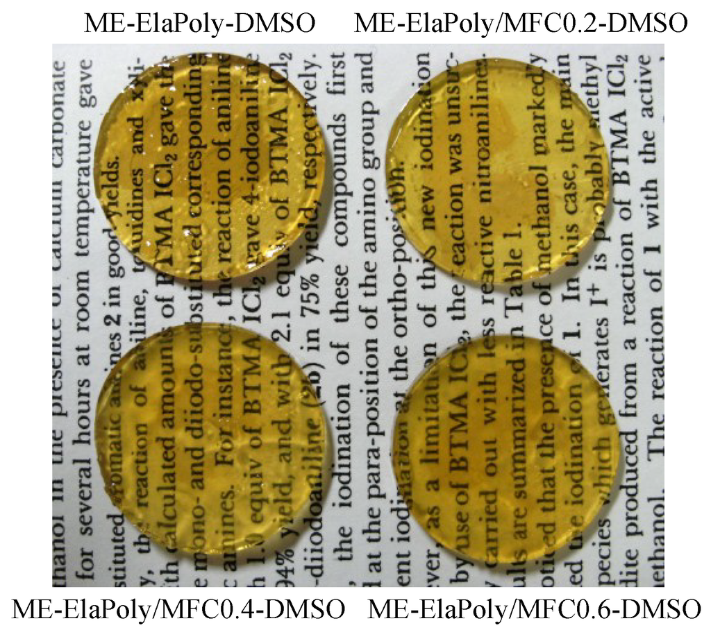 Since ME-ElaPoly is soluble in DMSO but insoluble in water, photocrosslinked gel was prepared by photoirradiation of DMSO solution of ME-ElaPoly in the presence of photoinitiator followed by solvent exchange with water. The concentration of MFC was varied from 0.2%–0.6% against the whole weight of gel. The composite gel samples prepared in the present study were designated as “ME-ElaPoly/MFC X”, where X is the concentration of MFC (in weight percentage). ME-ElaPoly-DMSO organogel was a transparent gel with yellowish color. As-prepared ME-ElaPoly/MFC-DMSO organogels were also transparent, and the increase of MFC content did not significantly affect the appearance (Figure 3). After solvent exchange with water, the gels slightly shrunk and became turbid (Figure 4). The turbidity of ME-ElaPoly/MFC hydrogels increased with MFC content.