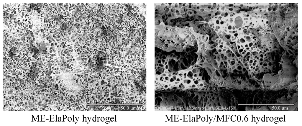 Figure 5 shows morphology of the cross-section of the lyophilized ME-ElaPoly and ME-ElaPoly/MFC0.6 gel observed by FE-SEM. All samples exhibited the porous morphology, and pull-out nanofibers of MFC were observed in ME-ElaPoly/MFC. The pore size was 2~8 μm, and these pores were opened by removal of water from hydrogels. The pore size of ME-ElaPoly/MFC0.6 was larger than that of ME-ElaPoly. MFC embedded in ME-ElaPoly cell walls of the gel was not obviously observed, and some pores were found to align along cellulose fibers. The morphology implies an interaction occurred between ME-ElaPoly and MFC. MFC seemed to disperse homogeneously in ME-ElaPoly networks.