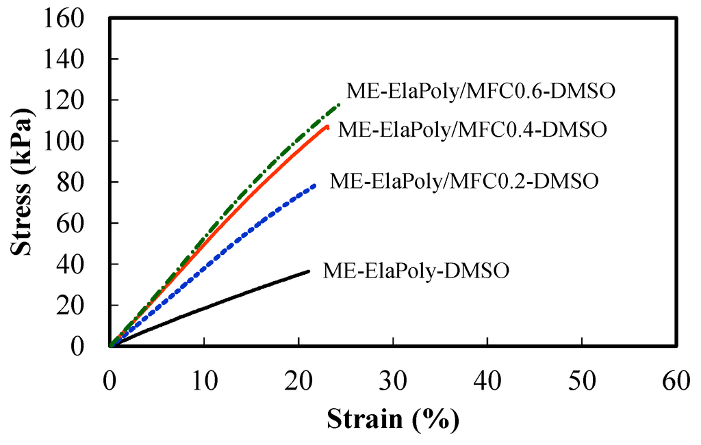 Stress–strain curves of ME-ElaPoly-DMSO organogel, ME-ElaPoly/MFC0.2-DMSO organogel, ME-ElaPoly/MFC0.4-DMSO organogel, and ME-ElaPoly/MFC0.6-DMSO organogel.