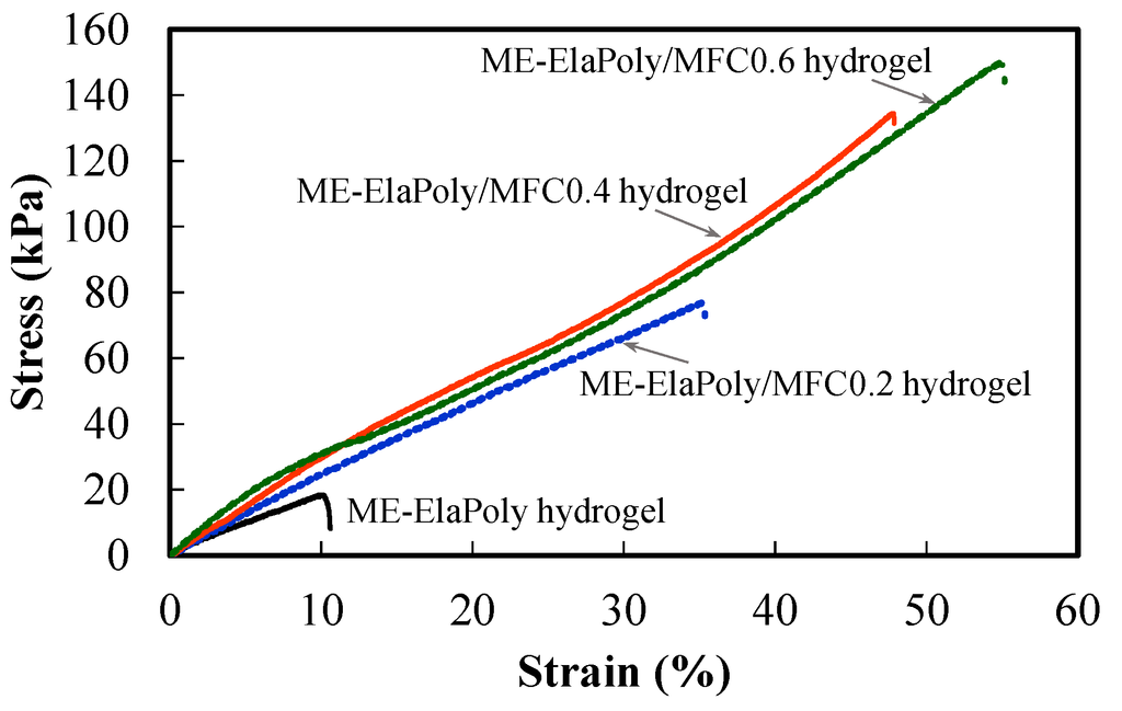 Stress–strain curves of ME-ElaPoly hydrogel, ME-ElaPoly/MFC0.2 hydrogel, ME-ElaPoly/MFC0.4 hydrogel, and ME-ElaPoly/MFC0.6 hydrogel.