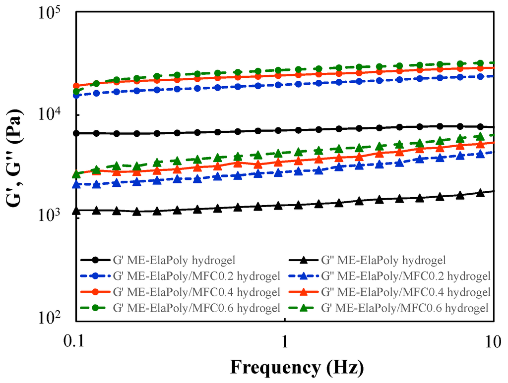 Figure 8 shows the viscoelasticity of ME-ElaPoly/MFC hydrogels in the frequency range of 0.1–10 Hz. All samples showed the typical gel behavior with storage modulus (G′) being higher than loss modulus (G″) over the whole frequency range. G′ was independent of oscillatory frequency, and increased with an increase of MFC content. G″ of ME-ElaPoly/MFC hydrogel increased gradually with an increase of frequency. The slight change in G″ was shown also in the gelatin-derived hydrogel reinforced with imogolite nanofibers [49].