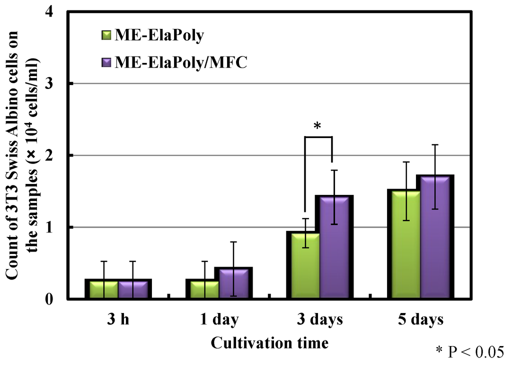 Cell proliferation on ME-ElaPoly and ME-ElaPoly/MFC hydrogel was assayed using 3T3 Swiss Albino mouse embryo fibroblast cells. Figure 9 shows the numbers of cells that adhered to each sample. There were very few cells that were dead on ME-ElaPoly and ME-ElaPoly/MFC. The proliferation was not higher than PS culture plate that was optimized for cell culture. The similar results were also observed in a study where vascular smooth muscle cells were seeded on an elastin-based material crosslinked with ethylene glycol diglycidyl ether [10]. After 1-day and 3-day culture, the number of the cells adhered to ME-ElaPoly/MFC was higher than that on ME-ElaPoly. After 7-day culture, however, there was no significant difference between these two materials. The result suggests that the existence of MFC presumably promotes the initial attachment of cells, but does not influence the cell proliferation. Figure 10 shows the morphology of the cells attached onto ME-ElaPoly and ME-ElaPoly/MFC. After 3-day culture, there existed many spread cells on ME-ElaPoly/MFC. After 7-day culture, most cells spread and gathered on both substrates. Fibroblast cells attached to materials are known to secrete cell growth factors such as fibronectin [50]. Therefore, it is reasonable that fibroblast cells gathered.