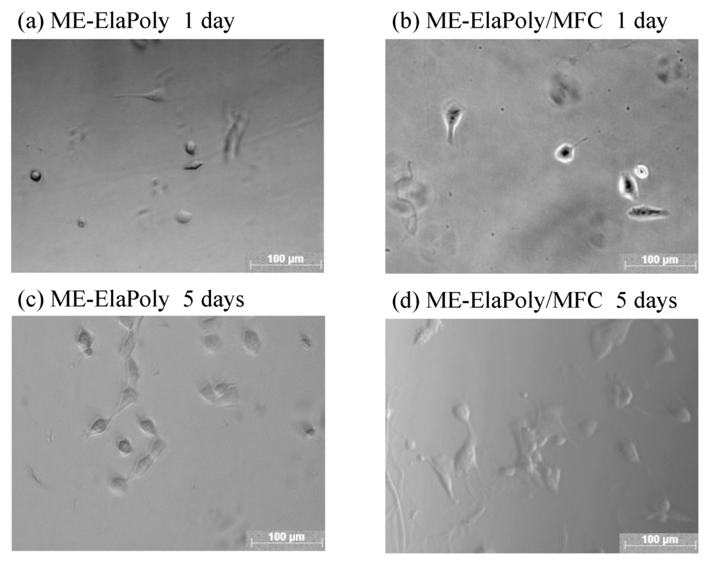 Phase contrast microscope observation of grown cells on (a) ME-ElaPoly and (b) ME-ElaPoly/MFC after 1-day culture, and cells on (c) ME-ElaPoly and (d) ME-ElaPoly/MFC after 5-day culture.