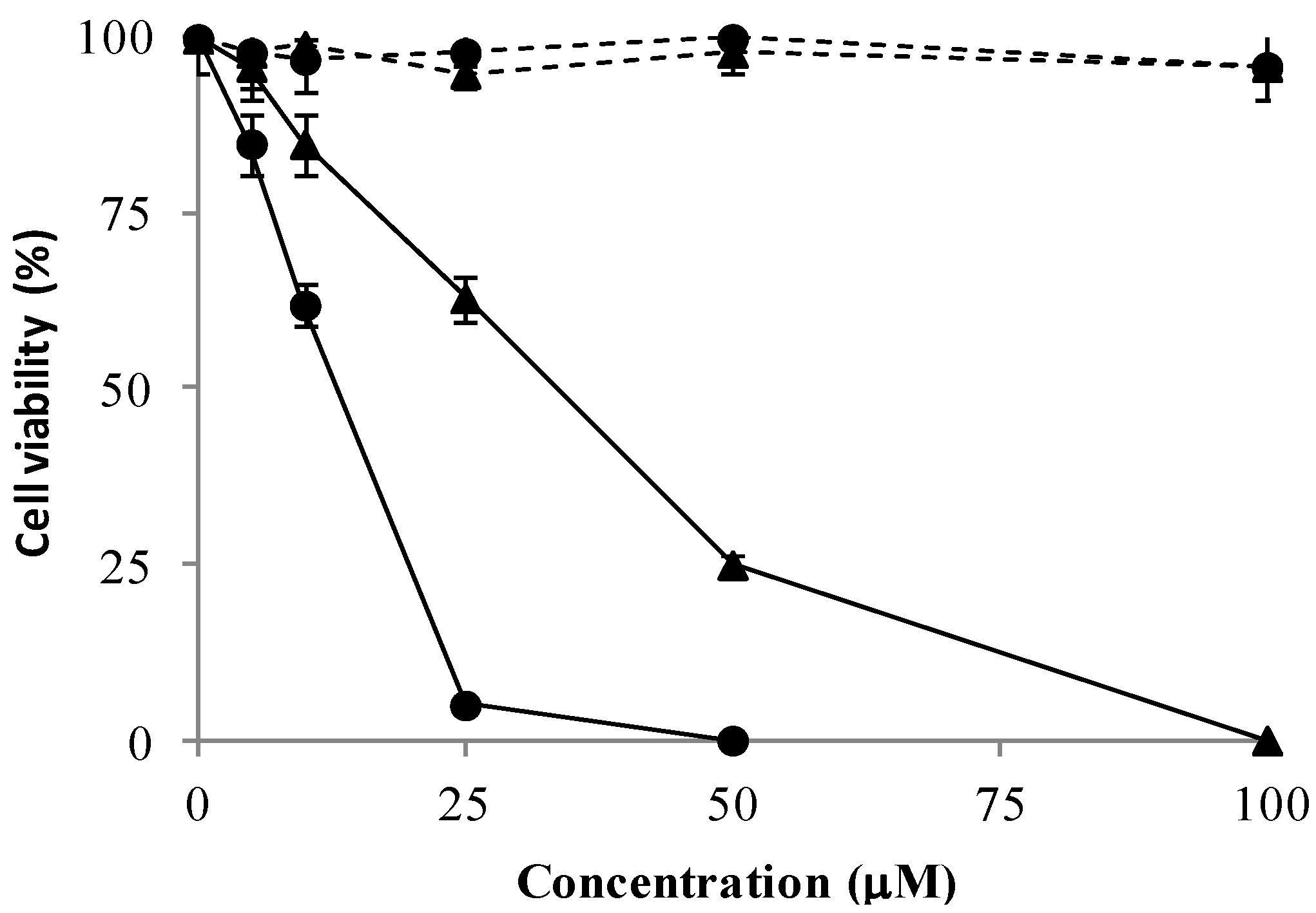 Effect of 1k (triangle) and 4c (circle) on the viability of human intestinal cell lines either tumoral (HCT-116; full line) or normal-like (differentiated Caco-2; dashed line). Cells were treated with the compounds 1k and 4c and cell survival was measured after 24 h by MTT assay in comparison to cells treated with vehicle alone (control). Values are the mean of three separate experiments in triplicate.