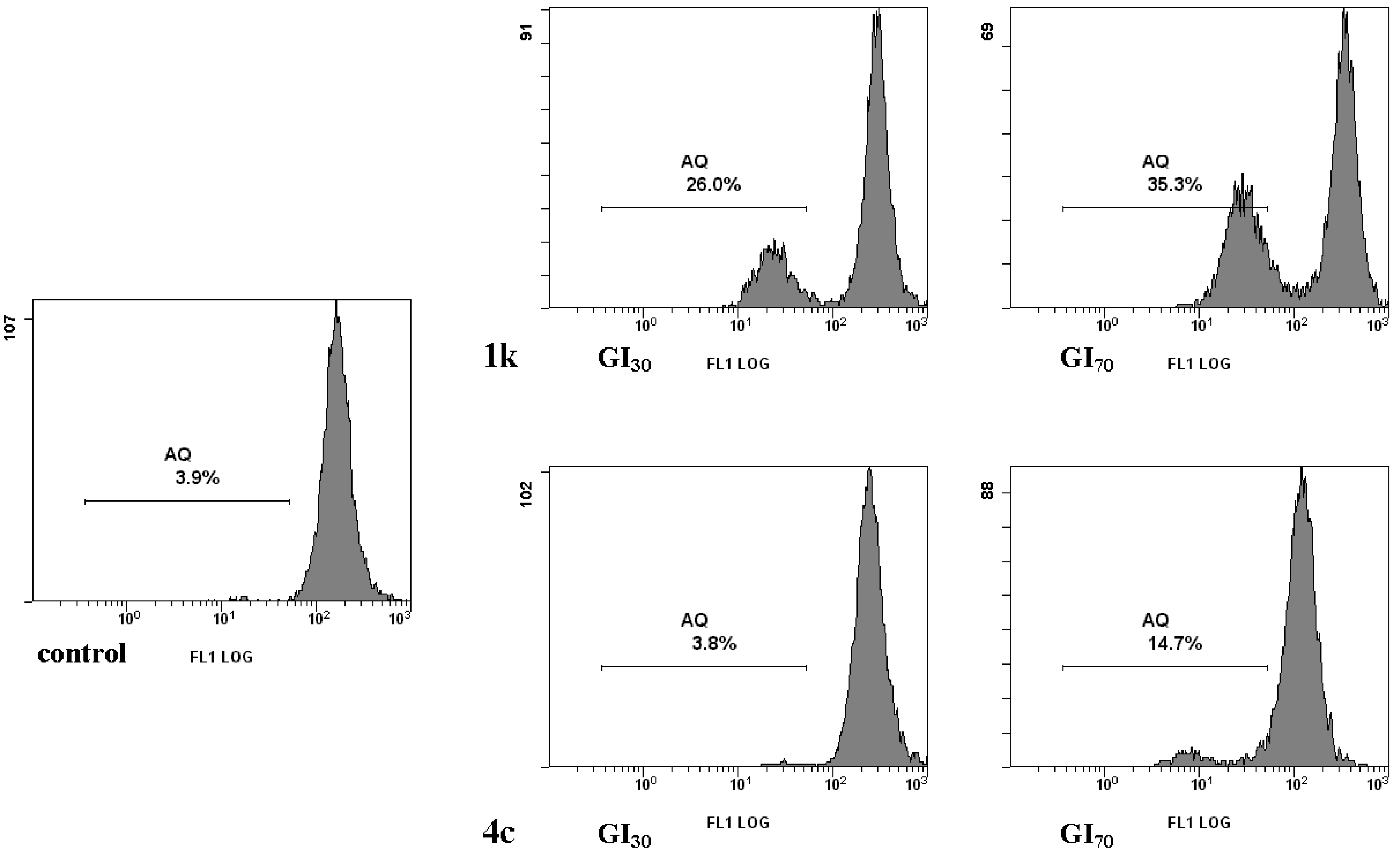 Cell cycle stage was analyzed by flow cytometry. HCT-116 cells (5.0 × 104 cells/cm2) were seeded in triplicate in 24-wells culture plates. After an overnight incubation, the cells were washed with fresh medium and incubated with compounds 1k and 4c in RPMI for 24 h. Then cells were harvested by trypsinization. Aliquots of 1 × 106 cells were washed with PBS and incubated in the dark in a PBS solution containing 20 μg/mL propidium iodide (PI) and 200 μg/mL RNase, for 30 min, at room temperature. Then samples of at least 1.0 × 104 cells were subjected to fluorescence-activated cell sorting (FACS) analysis by Epics XL™ flow cytometer using Expo32 software (Beckman Coulter, Fullerton, CA, USA).