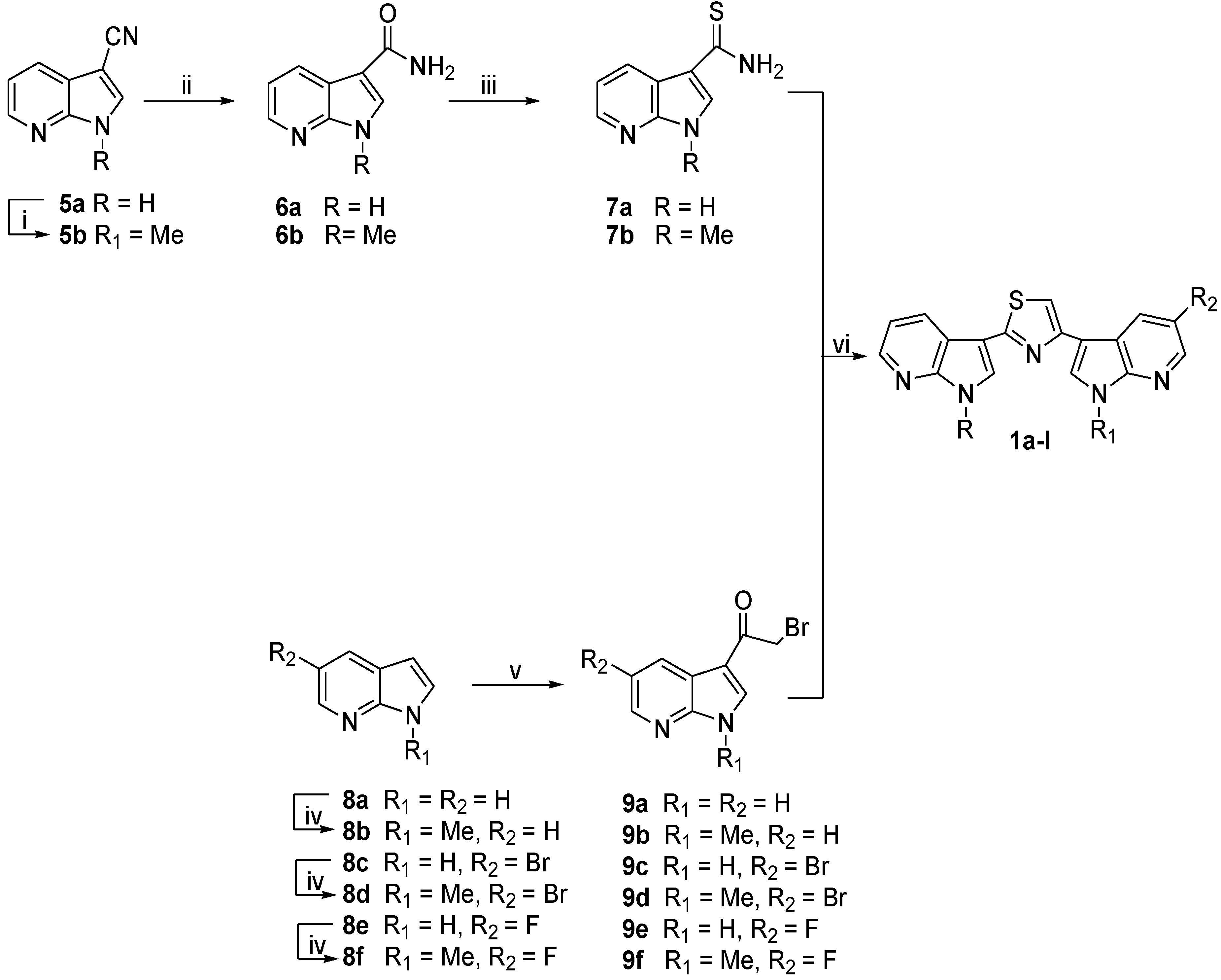 3-Bromoacetyl-pyrrolo[2,3-b]pyridines 9a–f were efficiently synthesized (70%–92%) by acylation of the corresponding pyrrolo-pyridines 8a–f with bromoacetyl bromide (BrCOCH2Br) in the presence of aluminium chloride (AlCl3) in dichloromethane (DCM) (Scheme 1) [42]. Reaction of pyrrolo[2,3-b]pyridine-carbothioamides 7a,b and 3-bromoacetyl-pyrrolo[2,3-b]pyridines 9a–f in ethanol (EtOH) under reflux gave the desired thiazolyl-bis-pyrrolo[2,3-b]pyridines 1a–l in good to excellent yields (60%–94%) (Scheme 1).
