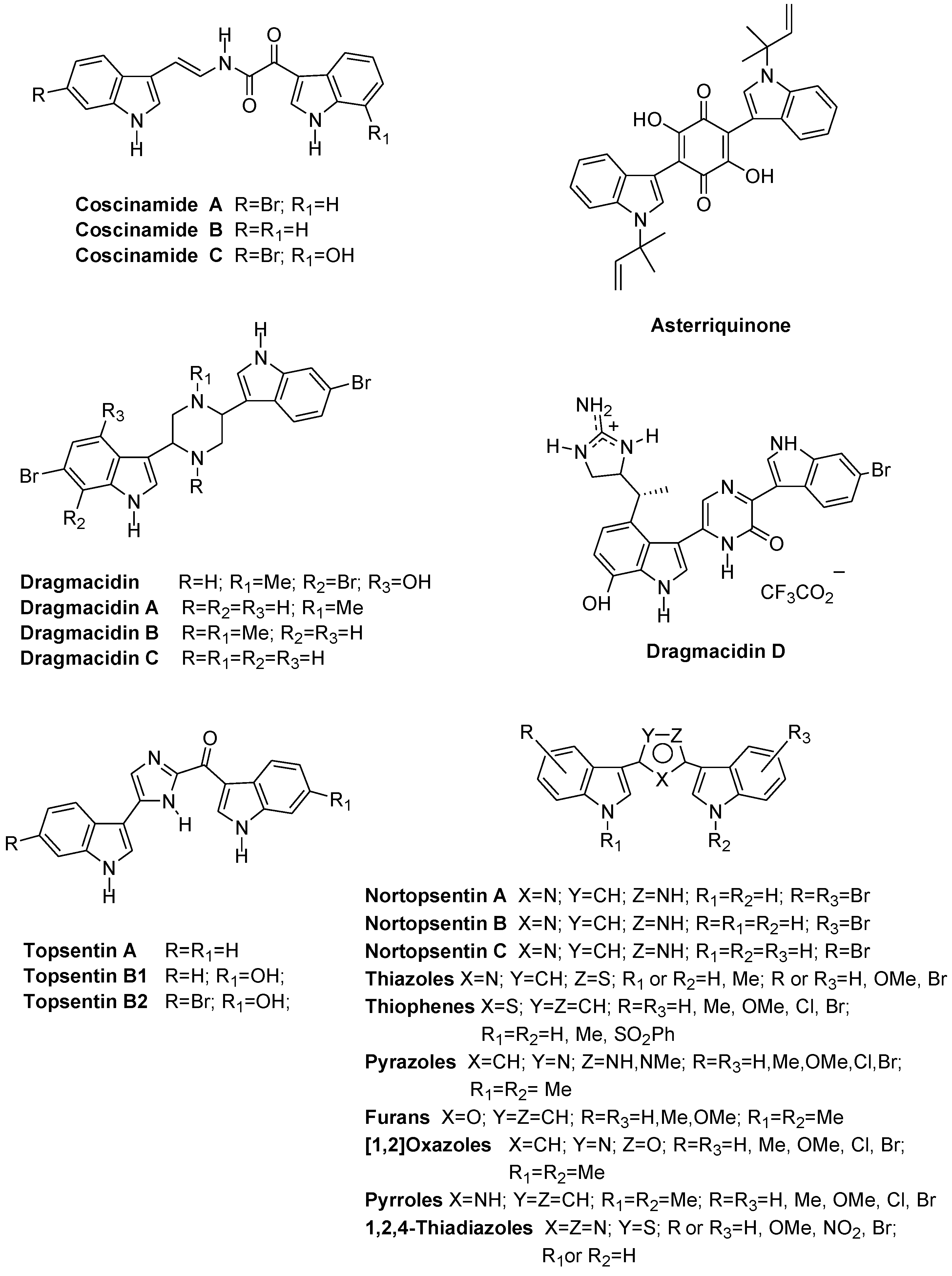 - Bartik, K.; Braekman, J.C.; Daloze, D.; Stoller, C.; Huysecom, J.; Vandevyver, G.; Ottinger, R. Topsentin, new toxic bis-indole alkaloids from the marine sponge Topsentia genitrix. Can. J. Chem. 1987, 65, 2118–2121. [Google Scholar] [CrossRef]
