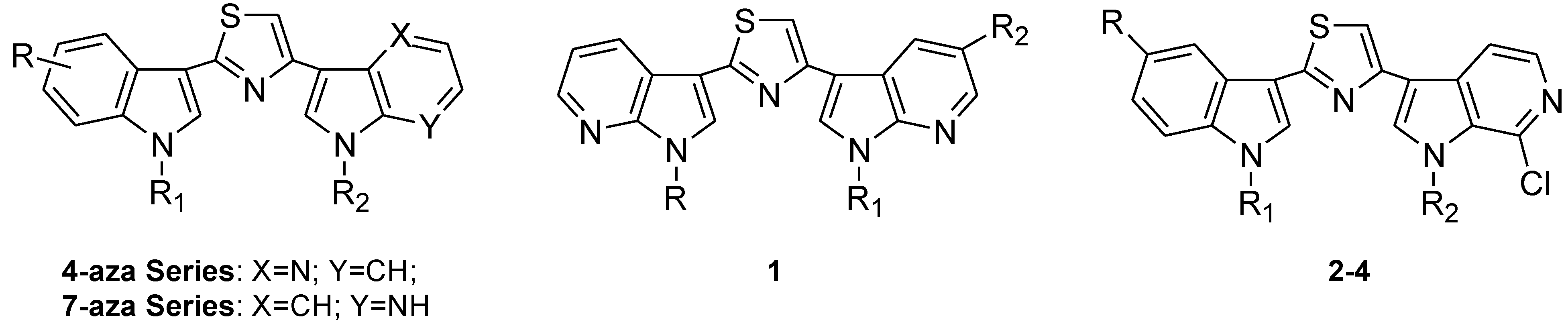 Substituted thiazolyl-bis-pyrrolo[2,3-b]pyridines 1a–l and indolyl-thiazolyl-pyrrolo[2,3-c]pyridines 2a–j, 3a–f, 4a–f.