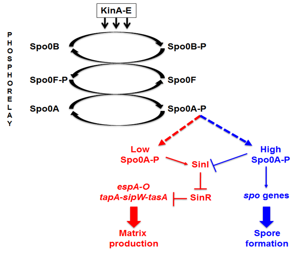 Spore formation is induced by environmental conditions that do not allow cell growth, such as a blockage of DNA replication and a decline in available nutrients [5]. However, producing a spore is not the only possibility for cells unable to continue vegetative growth. In Bacillus subtilis, when planktonic cells reach the end of the exponential phase of growth they can follow alternative developmental pathways, with some cells producing a polymeric matrix rich in sugars and proteins and assembling into a multicellular biofilm and others entering the irreversible program of spore formation [6,7,8,9]. In a planktonic cell, population matrix and spore production are mutually exclusive cell fates [6,9] and both are bimodal processes in which cells follow either one or the other pathway [8,9]. Both processes are induced by a series of histidine kinases, KinA–E, which activate a phosphorelay that culminates in the phosphorylation and activation of the master transcriptional regulator Spo0A [10,11]. As summarized in Figure 1, when present in the cytoplasm at low concentration Spo0A–P upregulates SinI, an anti-repressor that antagonizes the biofilm repressor SinR [10]. Relief of SinR-mediated repression, then, causes the expression of genes coding for either structural components of the matrix or proteins needed for the synthesis/transport of matrix components [5,10]. High levels of Spo0A–P instead block matrix formation and activate the expression of early sporulation genes, thus inducing spore formation [5,10]. The key role of SinR for matrix production in B. subtilis is also suggested by its identification as a mutational target for fine-tuning of biofilm formation [12].
