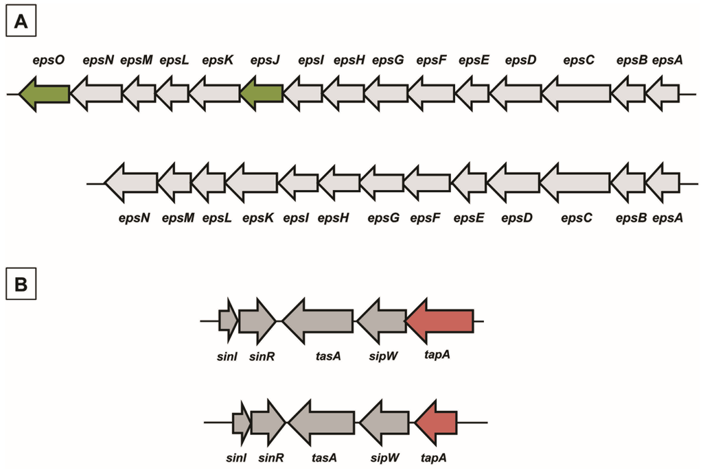 Chromosomal organization of genes involved in matrix synthesis in B. subtilis and B. pumilus. (A) The epsA–O operon in B. subtilis (top) and B. pumilus (bottom). In dark green are indicated two genes present in B. subtilis and lacking in B. pumilus. (B) Chromosomal organization of the sinI–sinR gene pair and the tapA-sipW-tasA operon in B. subtilis (top) and B. pumilus (bottom). In red is the tapA gene, significantly smaller in B. pumilus than in B. subtilis.