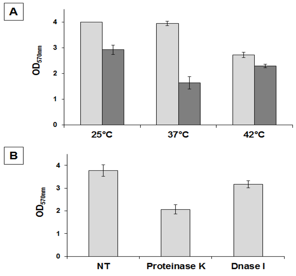 To test biofilm production, overnight cultures were used to inoculate liquid LB and DS medium and cells grown at 25 °C, 37 °C, and 42 °C in static conditions for up to 48 h. When required, LB medium was supplemented with proteinase K (0.1 mg/mL) (Qiagen, Milan, Italy) or DNaseI (5 U/mL) (Qiagen, Milan, Italy) to assess whether proteins and/or extracellular DNA are important components of the biofilm matrix. Protease and nuclease treatments prevent the accumulation of proteins and DNA, respectively, outside the cell. The medium was removed and the wells (35-mm culture dish) were washed five times with dH2O to remove loosely associated bacteria. Plates were air-dried for 30 min and each well was stained for 30 min with 1 mL 0.1% (wt/vol) crystal violet in an isopropanol-methanol-PBS solution (1:1:18 (vol/vol)). Crystal violet will bind primarily to negatively-charged molecules of biofilm biomass (cell surface, extracellular DNA, and EPS) allowing the assessment of the biofilm produced [13]. After staining, the wells were washed with dH2O and air-dried (about 30 min). The crystal violet bound was extracted with an ethanol-acetone (80:20) solution and the optical density (OD) of each sample was measured at 570 nm.