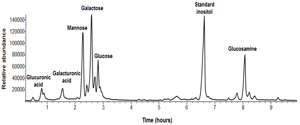 In addition, we analyzed the chemical composition of the sugars of the EPS of B. pumilus SF214 (Figure 4 and Table 2). EPS monosaccharides were analyzed by GC-MS as acetylated O-methyl glycosides. The sample was treated with 1.25 M MeOH/HCl and subsequently acetylated with acetic anhydride in pyridine and analyzed by GC-MS. The evaluation of the retention times and the fragmentation pattern from the GC-MS spectra compared with authentic standards allowed the identification of the monosaccharide residues. The sample contained galactose as its major component, together with minor amounts of mannose, 2-deoxy-2-amino glucose (glucosamine), galacturonic acid, and glucuronic acid (Figure 4). The relative abundances of monosaccharides are shown in Table 2.
