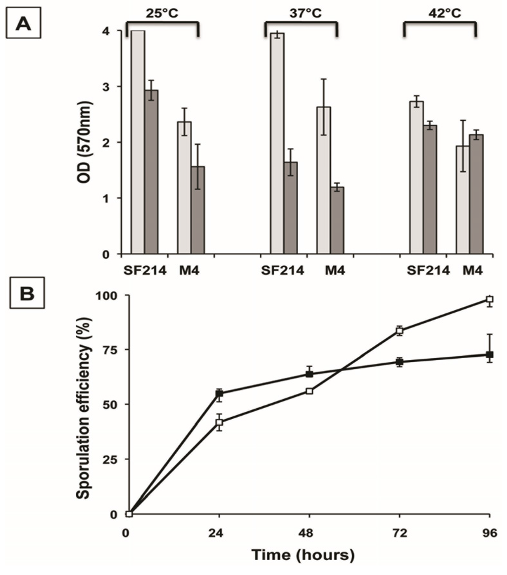 Biofilm formation (A) and sporulation efficiencies (B) of strain SF214 and M4 mutant. (A) Cells were grown at the indicated temperatures in rich (LB; light gray bars) or sporulation-inducing (DS; dark gray bars) media for 48 h. Cells were then removed, wells were stained, washed and the OD (570 nm) determined. (B) At the indicated times a sample of each growing culture (SF214 and M4 strain in black and white squares, respectively) was collected and split into two aliquots that were diluted and plated on LB plates. One of the aliquots was heat-treated (20 min at 80 °C) to kill all vegetative cells before plating. For each time point, the sporulation efficiency is the percentage of cells growing after the heat treatment, considering as 100% the number of cells growing without the heat treatment.