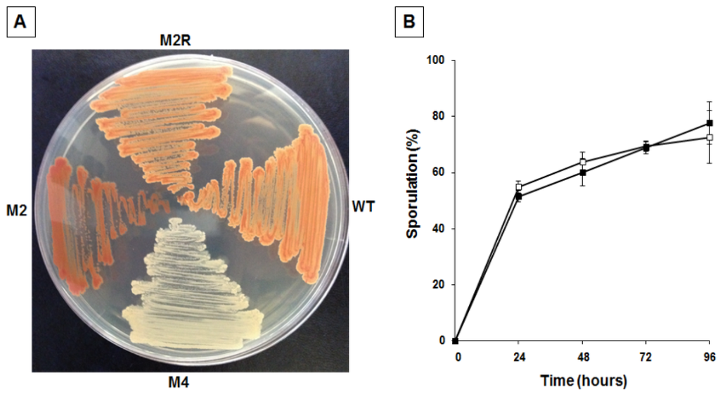 To confirm the link between pigmentation, matrix synthesis, and sporulation, we decided to identify and characterize other mutants with an altered pigmentation. Mid-exponential phase cells were incubated for different times with 10 mg of NTG and the percentage of survival assessed by colony forming unit (CFU) determination, as previously reported [18]. To minimize the possibility of having mutants carrying multiple mutations, only cells exposed to NTG for the shortest time were considered. NTG-treated cells were then diluted, plated, and checked for pigmentation after 36 h of incubation at 25 °C. We focused on a single strongly over-pigmented mutant, M2. As previously reported [18], B. pumilus SF214 is refractory to genetic transformation, making it extremely difficult to identify the mutation carried by M2. A first phenotypic characterization of the mutant revealed that it was totally unable to produce spores. This surprising observation induced us to consider the possibility that we had either isolated a contaminant of some other bacterial species or that more than one mutation was carried by the M2 strain. To address these points we first analyzed and compared the DNA sequences of genes coding for the 16S RNA (not shown) and several other genes (see Section 2.4) of SF214 and M2 strains. All M2 genes analyzed were identical to their counterparts in strain SF214 (see Section 2.4), allowing us to exclude that M2 was a contaminant of a different bacterial species. Then, to evaluate whether more than one mutation was carried by the M2 strain we followed a classical genetic approach. We observed that the over-pigmented phenotype reverted spontaneously at a frequency of 1 clone out of 109. Then, we analyzed one revertant, M2R, and observed that it was identical to strain SF214 for its pigmentation (Figure 6A) and for its efficiency in producing spores (Figure 6B). Reversion of both phenotypes at a frequency of one clone out of 109 makes it extremely unlikely that the two phenotypes are due to more than one mutation.