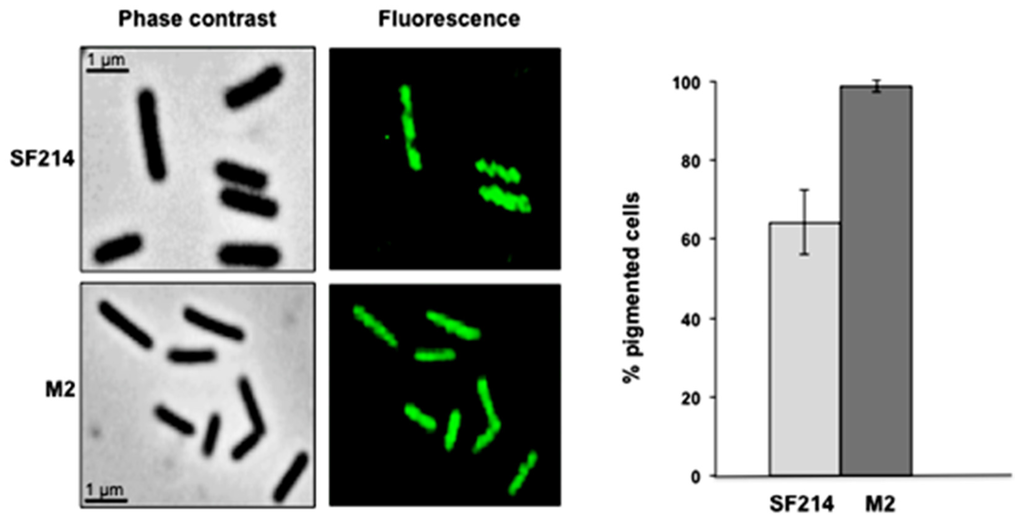 Pigmentation of strain SF214 and its mutant M2. Growing cells of strain SF214 and of the M2 mutant were analyzed by phase contrast and fluorescence microscopy. A representative microscopy field for each strain is shown by phase contrast and fluorescence microscopy. Over 1000 cells of 20 different microscopy fields for each strain were observed and the percentage of fluorescent cells reported.