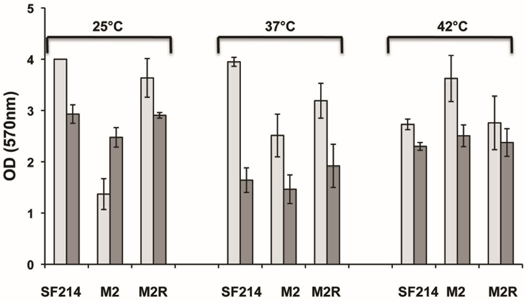 A phenotypic analysis of M2 mutant cells showed that they are thinner (average width of 0.58 ± 0.1 and 0.45 ± 0.08 μm for SF214 and M2 strains, respectively) than wild-type cells. This phenotype has been associated with alteration in the efficiency of biofilm formation in B. subtilis [23,24] as well as in other microorganisms [25,26]. To verify whether these phenotypes are also linked to matrix synthesis in B. pumilus, we analyzed biofilm synthesis in strains SF214 and M2. As shown in Figure 8, biofilm production was clearly reduced in M2 in a rich (LB) medium at 25 and 37 °C, while at 42 °C the situation was reversed, with the mutant producing more biofilm than strain SF214 (Figure 8). When cells were grown in a sporulation-inducing (DS) medium, wild-type and mutant strains produced similar amounts of biofilm at all three temperatures tested (Figure 8). In the experiments shown in Figure 8 we also analyzed the amount of biofilm produced by the revertant strain M2R, which, as expected, behaved like the wild-type strains at all conditions tested (Figure 8). Experiments shown in Figure 8 then suggest that the observed changes in cell morphology are linked to a defect in matrix synthesis in the M2 mutant. In conclusion, the mutation carried by M2 increased pigment synthesis, blocked sporulation, and affected biofilm formation. Therefore, as in the case of the M4 mutant reported above, for the M2 mutant it is also more likely that the mutation is in a gene coding for regulatory factor rather than in one of the genes of the pigment biosynthetic pathway.