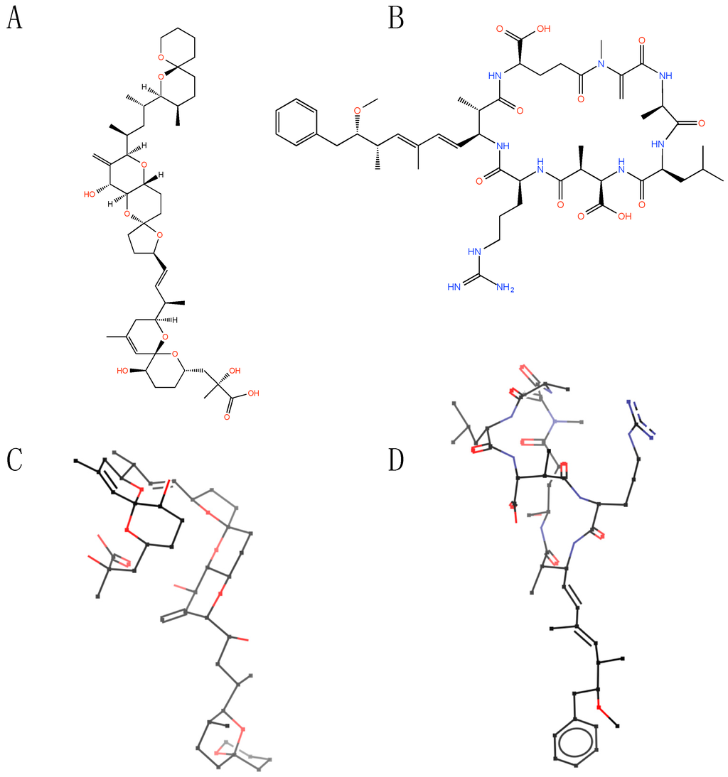 (A,B) Structure of okadaic acid (A) and microcystin (B); (C,D) the three-dimensional representation of okadaic acid (C) and microcystin (D) when complexed with protein phosphatase 1 (PP1). The OA-PP1structure is from [], and the MC-LR-PP1 structure is from [].