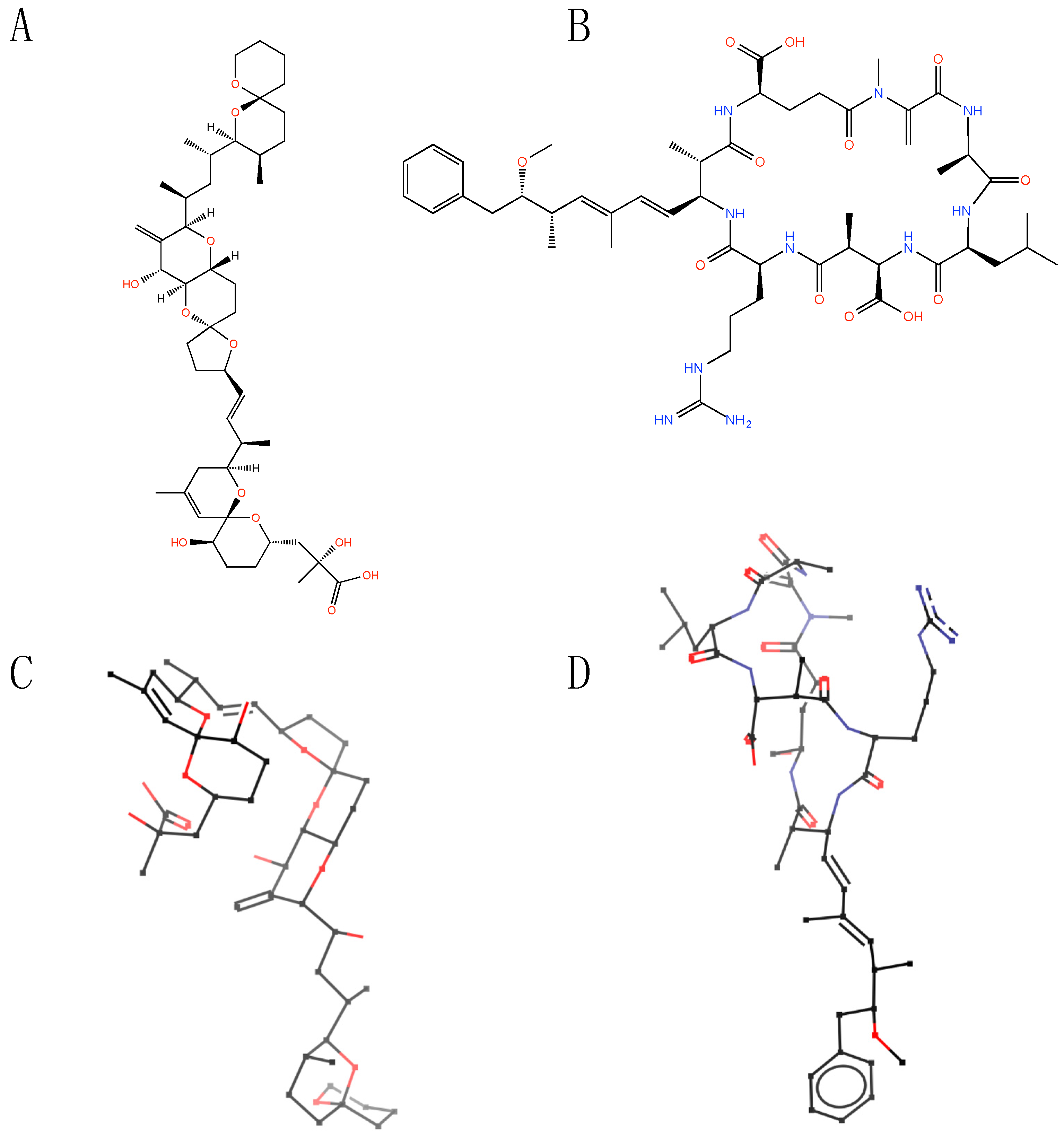 (A,B) Structure of okadaic acid (A) and microcystin (B); (C,D) the three-dimensional representation of okadaic acid (C) and microcystin (D) when complexed with protein phosphatase 1 (PP1). The OA-PP1structure is from [14], and the MC-LR-PP1 structure is from [13].