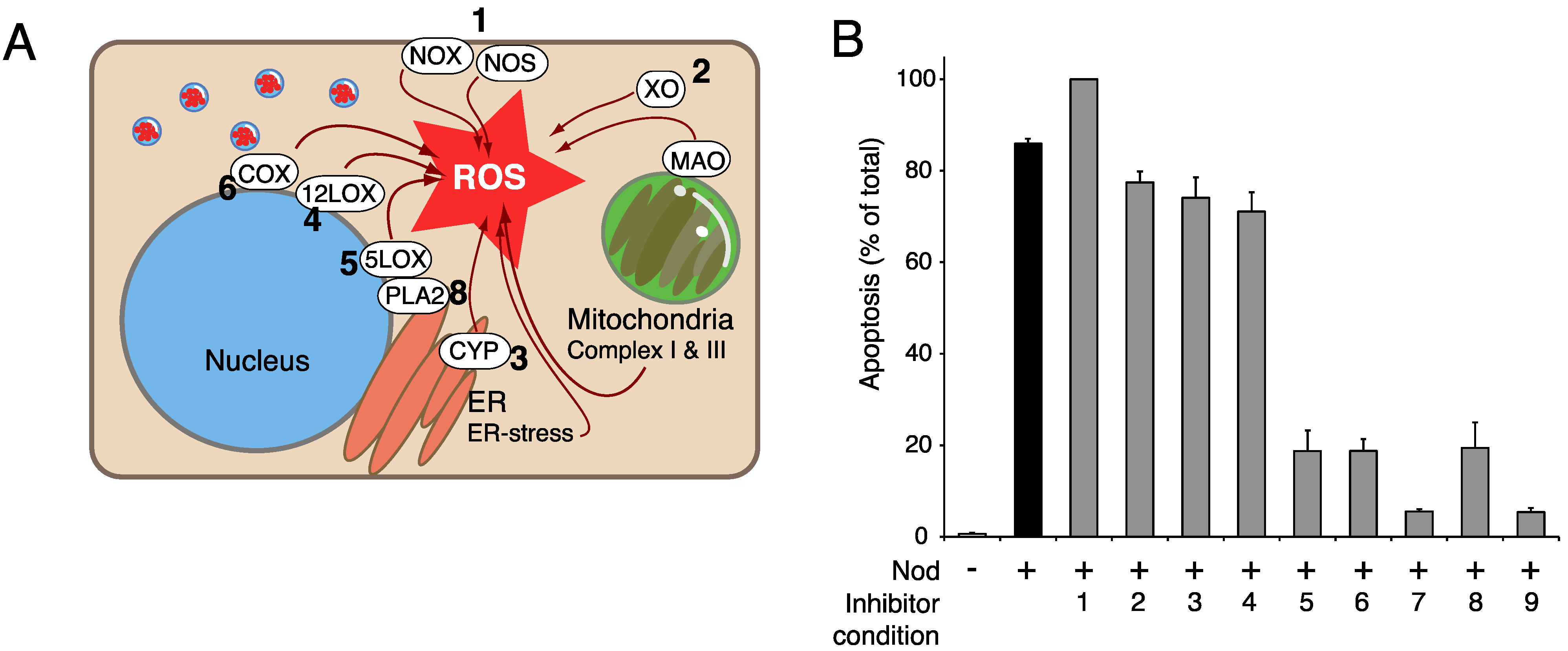 ROS-producing enzymes in PPI-induced apoptosis. (A) Illustrates some of the major cellular sources of reactive oxygen species (ROS). The illustration focuses on different ROS producing enzymes; NADPH oxidase (NOX), nitric oxide synthase (NOS), xanthine oxidase (XO), monoamine oxidase (MAO), cyclooxygenases (COX), 12-Lipoxygenase (12LOX), 5-Lipoxygenase (5LOX), and microsomal Cytochrome P450 complexes (CYP). Cellular phospholipase A2 (PLA2) does not generate ROS, but acts upstream of COX and 5LOX. The numbers in bold refers to the enzyme that is targeted by the inhibitors used in panel. (B). The effect of different inhibitors towards ROS producing enzymes was tested against nodularin (Nod, 100 nM, 75 min) induced apoptosis in isolated primary rat hepatocytes. The inhibitors (assigned with numbers) were: (1) Diphenyleneiodonium chloride (25 µM), (2) allopurinol (100 µM), (3) metyrapone (500 µM), (4) baicalein (5 µM), (5) AA861 (5 µM), (6) Indomethacine (10 µM), (7) nordihydroguaiaretic acid (20 µM), (8) arachidonyl trifluoromethylketone (5 µM), and (9) naringin (100 µM). After treatment, the cells were fixed evaluated for apoptosis and necrosis by microscopy. Treatment with nodularin gave rise to 86% apoptosis, compared to less than 1% in control.