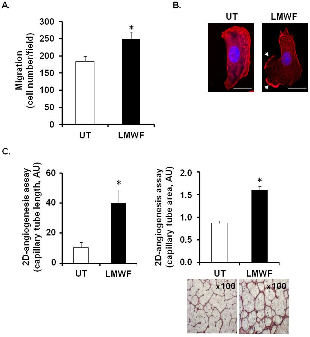 LMWF at 10 μg/mL, but not high molecular weight fucoidan (HMWF) (600 kDa) increased HUVEC migration through fibronectin-coated 8 µm-porous membranes by 36% ± 8% (Figure 1A and data not shown). Confocal microscopy confirmed that LMWF induced the formation of lamellipodia and ruffles, which characterize a migration phenotype and reorganized actin cytoskeleton (Figure 1B). Using a 2D-angiogenesis assay, we demonstrated that LMWF induced the formation of capillary tubes in Matrigel by increasing their length by 4 fold and their area up to 84% ± 8%, as compared to untreated (UT) control cells (Figure 1C).