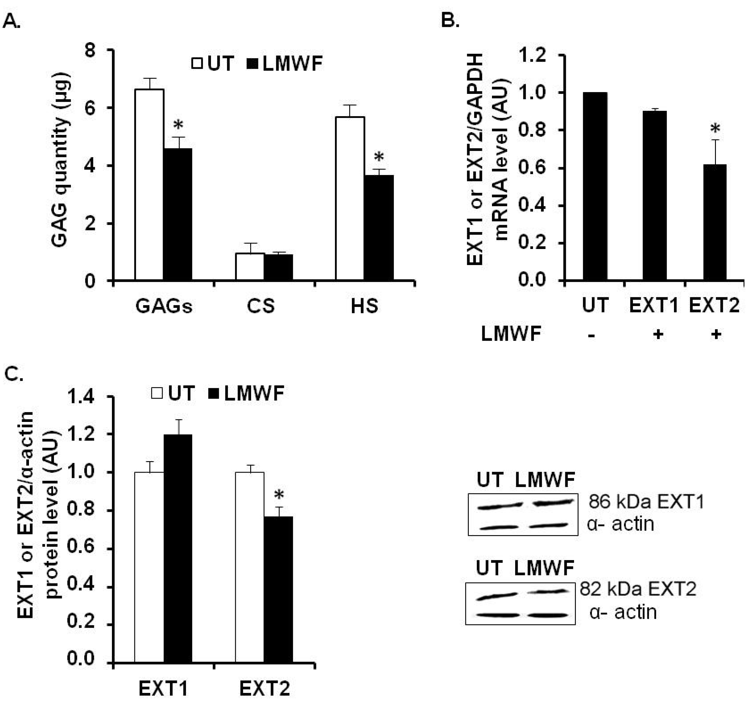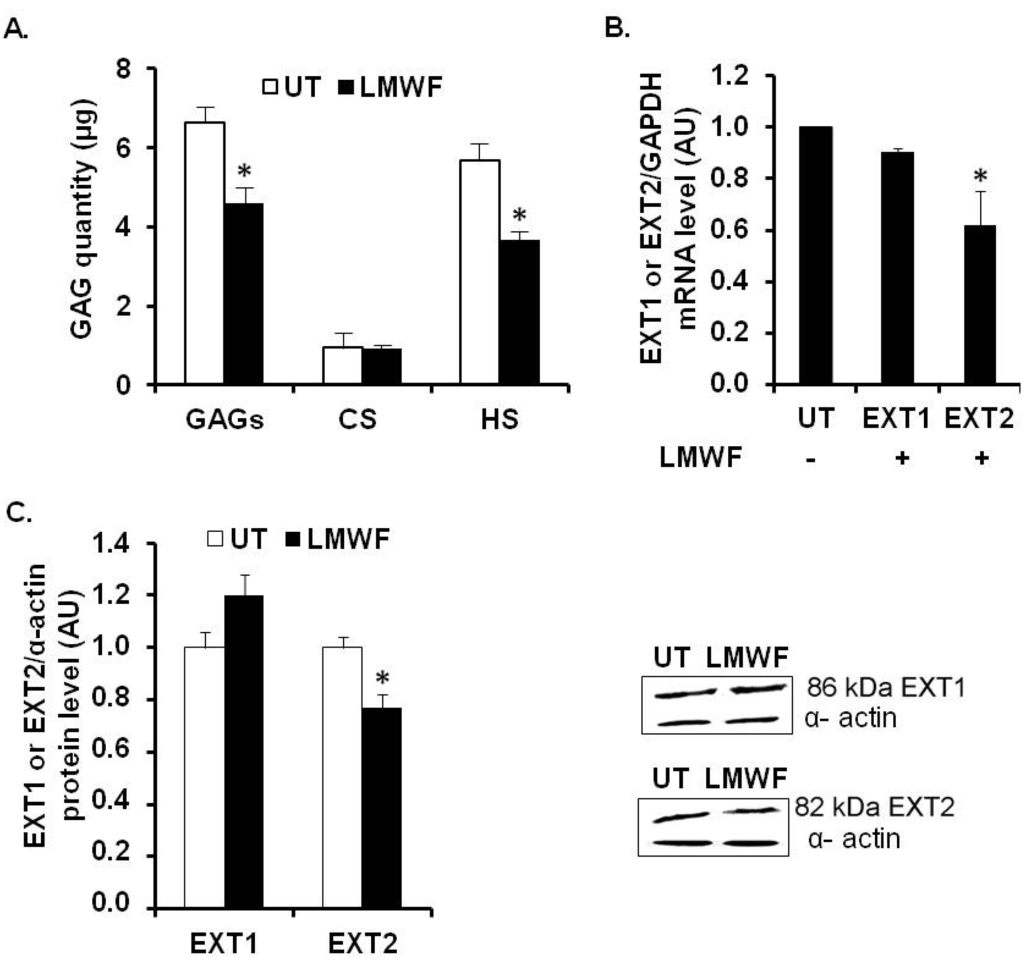 LMWF and glycosaminoglycan chain level in HUVECs. (A) Glycosaminoglycan quantification. HUVECs were incubated with 10 µg/mL LMWF for 24 h and the amount of total GAGs, CS and HS chains were determined in the supernatant according to a dimethyl-methylene blue (DMMB) assay; (B) Exostosin-1 and -2 (EXT1 or EXT2) mRNA levels were determined by real-time RT-PCR in cells treated with or without 10 µg/mL LMWF. (C) EXT1 or EXT2 protein levels were determined by western blot in cells treated with or without 10 µg/mL LMWF. Right panel shows a representative image of the western blot assay. * p < 0.05 versus control untreated (UT) cells. A.U.: arbitrary unit.