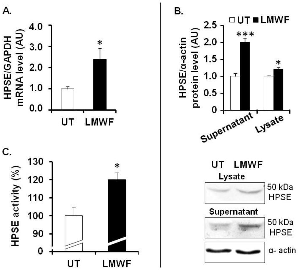 The HS-degrading enzyme heparanase (HPSE) is an endo-β-d-glucuronidase, which plays an important role in remodeling of the basement membrane and extracellular matrix during process of inflammation [13,14,15]. HPSE is synthesized as an inactive 65 kDa pro-form enzyme (pro-HPSE), can be transformed into active heterodimer consisting of 50 and 8 kDa subunits (active HPSE), and cleaves HS chains attached to proteoglycans, such as syndecans and perlecan [15,16]. HPSE mRNA expression, as assessed by quantitative RT-PCR, was increased by 2.4 fold in LMWF-treated cells, as compared to untreated control cells (Figure 3A). Active HPSE form (50 kDa) expression, as assessed by western blot, was significantly increased up to 2 fold in the supernatant or by 20% ± 5% in the lysate of the LMWF-treated cells (Figure 4B). HPSE activity was slightly but significantly increased up to 20% ± 3% in the lysate of LMWF-treated cells (Figure 3C), whereas it was not detected in the respective conditioned medium.