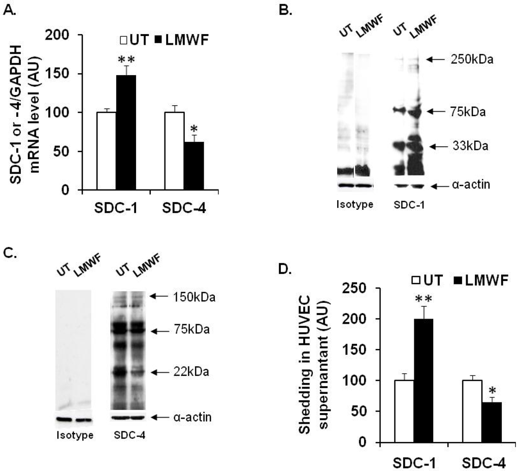 Taken together, LMWF modulate SDC-1 and SDC-4 gene expression and ectodomain shedding in HUVEC in vitro culture.