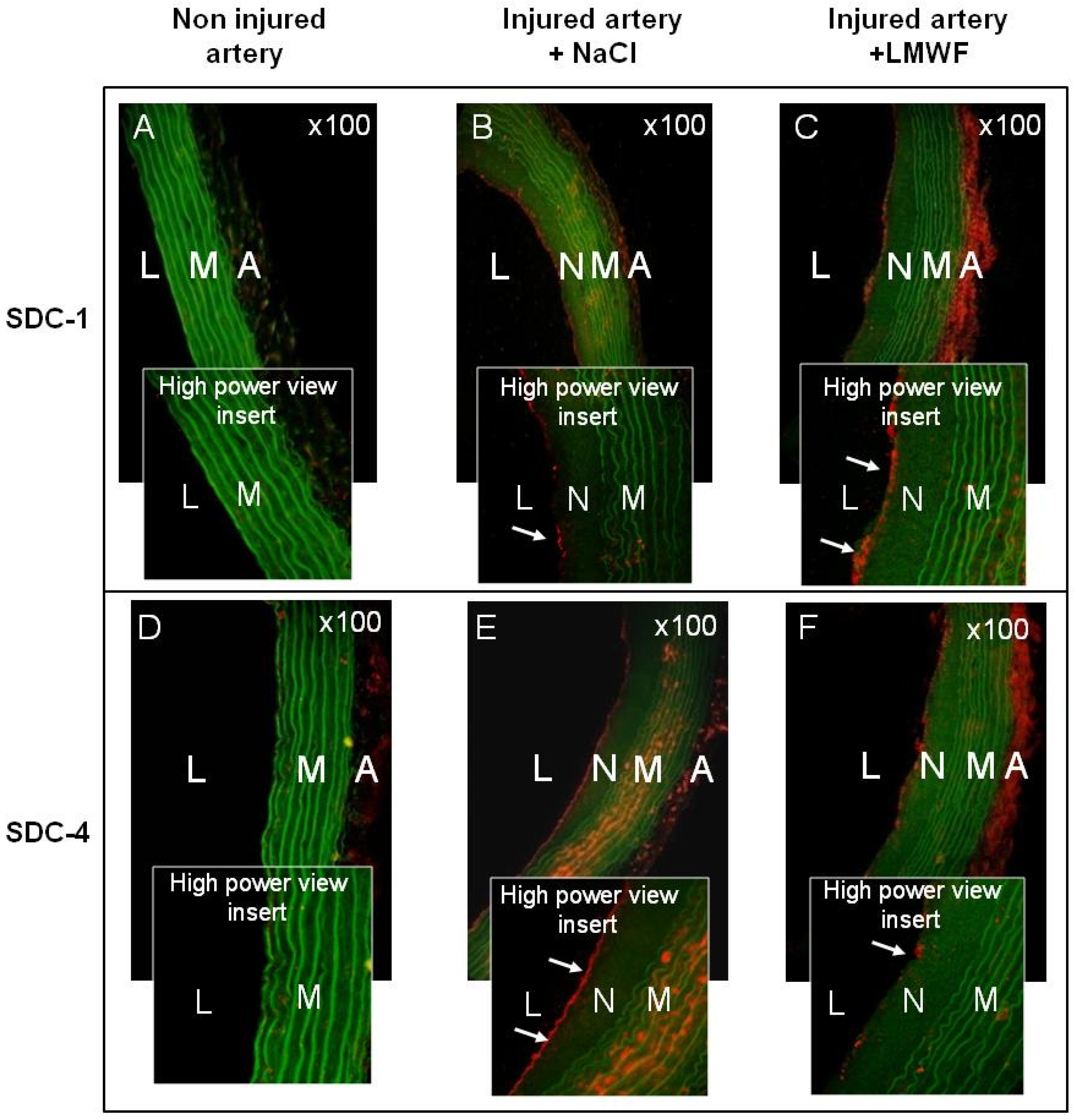 Effects of LMWF on the SDC distribution in rat balloon injured artery. SDC-1 and SDC-4 expressions were assessed using immunohistochemistry in rat model of intimal hyperplasia. (A) SDC-1 or (D) SDC-4 expressions in non injured arteries; (B) SDC-1 or (E) SDC-4 expressions in injured arteries treated with NaCl; (C) SDC-1 or (F) SDC-4 expressions in injured arteries treated with LMWF. White arrows indicate SDC expressions in the neointima layer in high power view inserts (red). Green: autofluorescence of the elastic fibers of the lamina. Magnification ×100, L: lumen, N: neointima, M: media, A: adventitia.