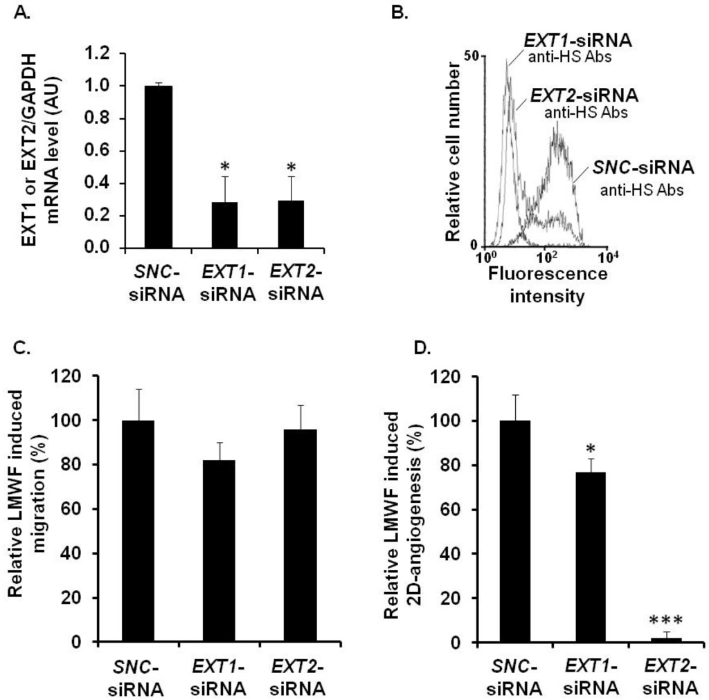 Assessment of EXT involvement in biological effects of LMWF in HUVECs. HUVECs were transfected with EXT1-siRNA or EXT2-siRNA or with SNC-siRNA control. (A) EXT1 or EXT2 mRNA levels were determined in EXT1-siRNA- or EXT2-siRNA- or SNC-siRNA-transfected control cell by real-time RT PCR. EXT1- or EXT2 mRNA level normalized to GAPDH mRNA level in SNC-siRNA-transfected control cells was arbitrarily set to 1; (B) The binding of 10E4 anti-HS antibodies to EXT2- or EXT1-siRNA transfected cells was compared to that of SNC-siRNA-transfected cells; (C) Migration was assayed in cells treated with or without 10 µg/mL LMWF; (D) 2D-angiogenesis was assayed in cells treated with or without 10 µg/mL LMWF. The difference in the capillary network length between LMWF-treated and untreated cells in each RNA interference condition (EXT1 or EXT2 silencing) was compared to that in SNC-siRNA-transfected cells. Control LMWF induction was arbitrary set at 100% for SNC-siRNA-transfected cells. * p < 0.05, *** p < 0.0005 versus SNC-siRNA-transfected control cells. A.U.: arbitrary unit.